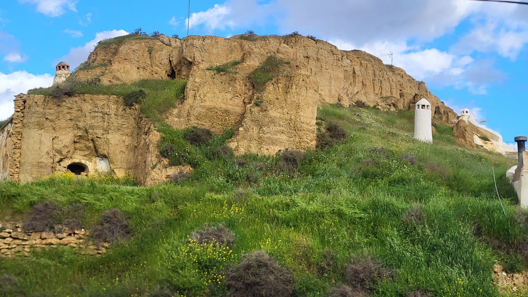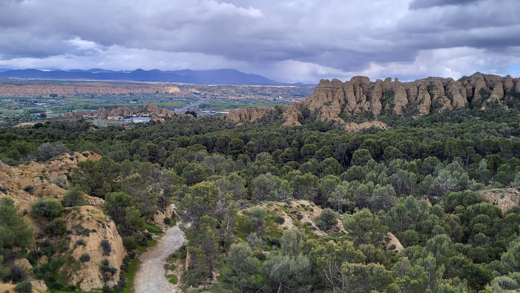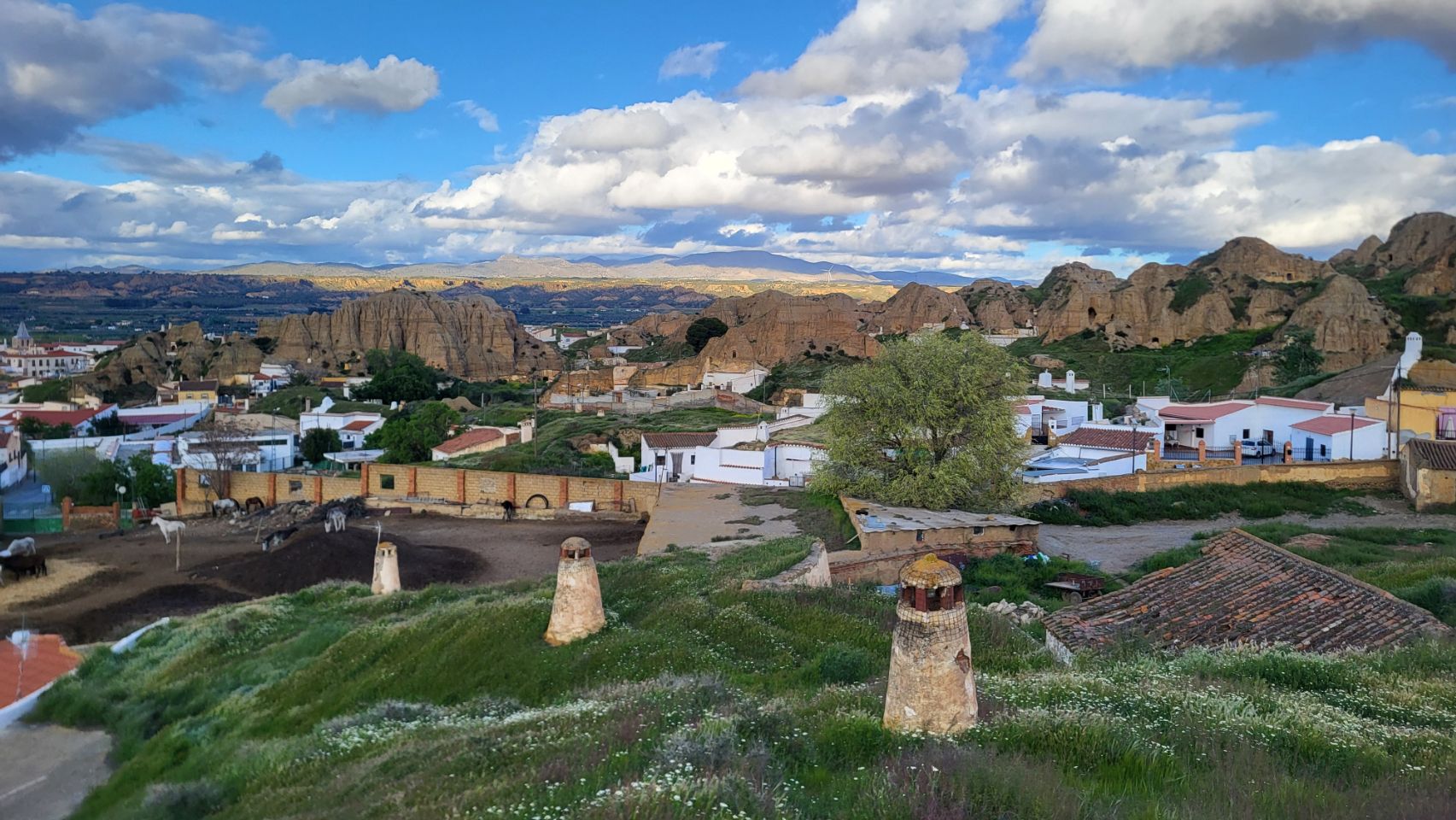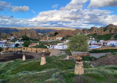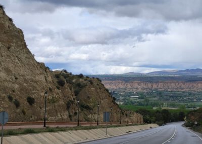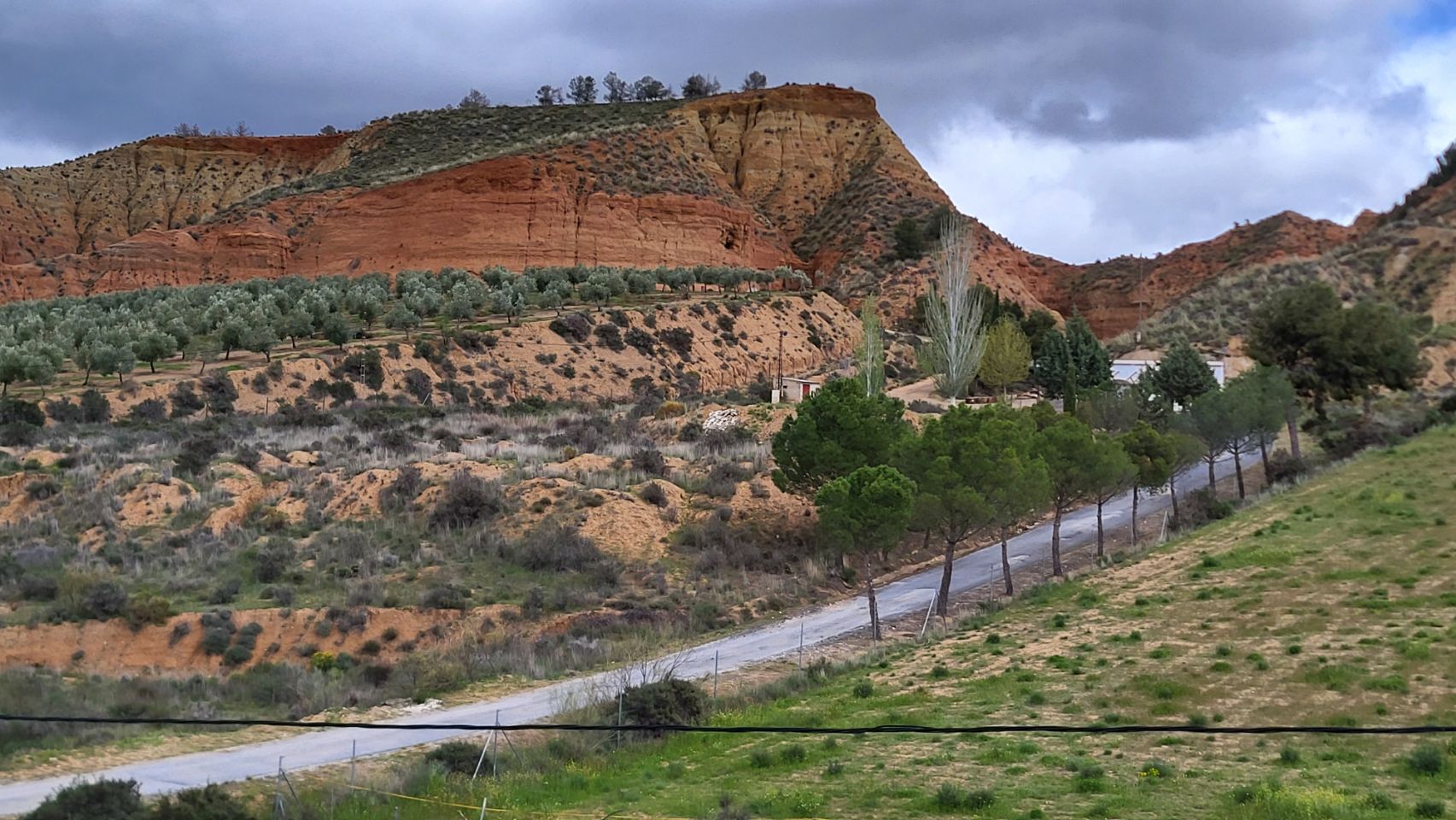 En net als we een stuk gaan afdalen wordt het droog, zodat we niet helemaal onderkoeld raken. Langzaam loopt de temperatuur wat op tot een graad of 10. Na de groene bergen komen we door een gebied met gele en rode zanderige hoge hellingen met grillige vormen. Na uren verschijnt er een dorp waar we eindelijk een koffie kunnen drinken. Niet veel laten arriveren we in Guadix. We zijn eerder vandaag een jonge Vlaamse fietser tegengekomen. Toevallig heeft hij hetzelfde hotelletje geboekt en is nèt voor ons gearriveerd. De eigenaar breekt het extra bed op onze kamer af zodat de fietsen daar kunnen staan.