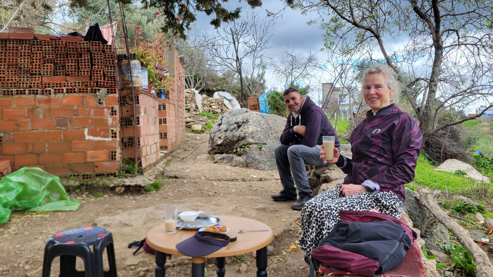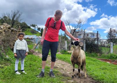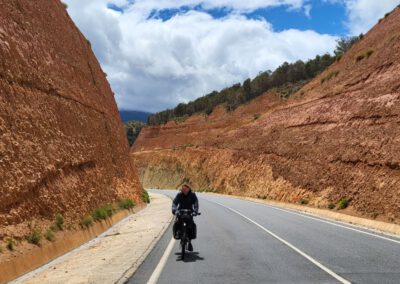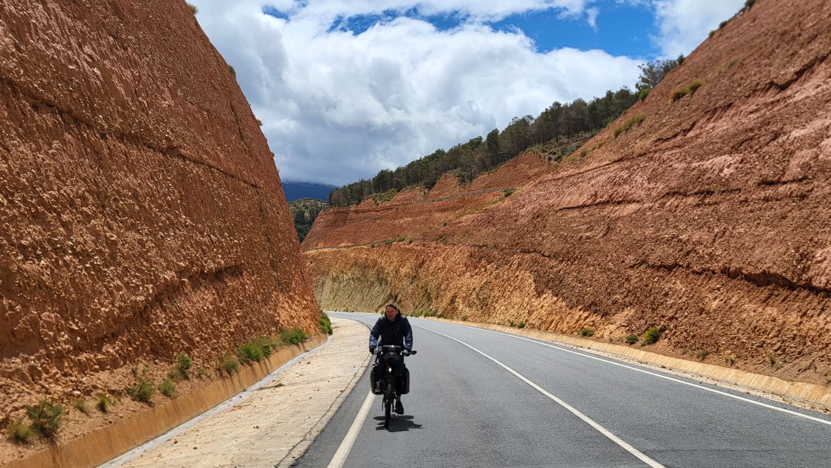 De route is mooi. We gaan door bergachtig gebied en hebben zelfs de wind in onze rug. Een berg opklimmen is nog altijd fijner dan tegenwind. We hebben eten bij ons en koffiewater en zoeken een picknickplekje. Dat is wel steeds een uitdaging hier. We willen niet in het zicht van de vastende mensen gaan zitten, maar uit alle hoeken en gaten komen steeds Marokkanen. Als we een afgelegen plekje vinden dan komt er wel weer een herder met zijn kudde te voorschijn. Zij doen er overigens niet moeilijk over, het is meer dat we hun vastentijd willen respecteren.