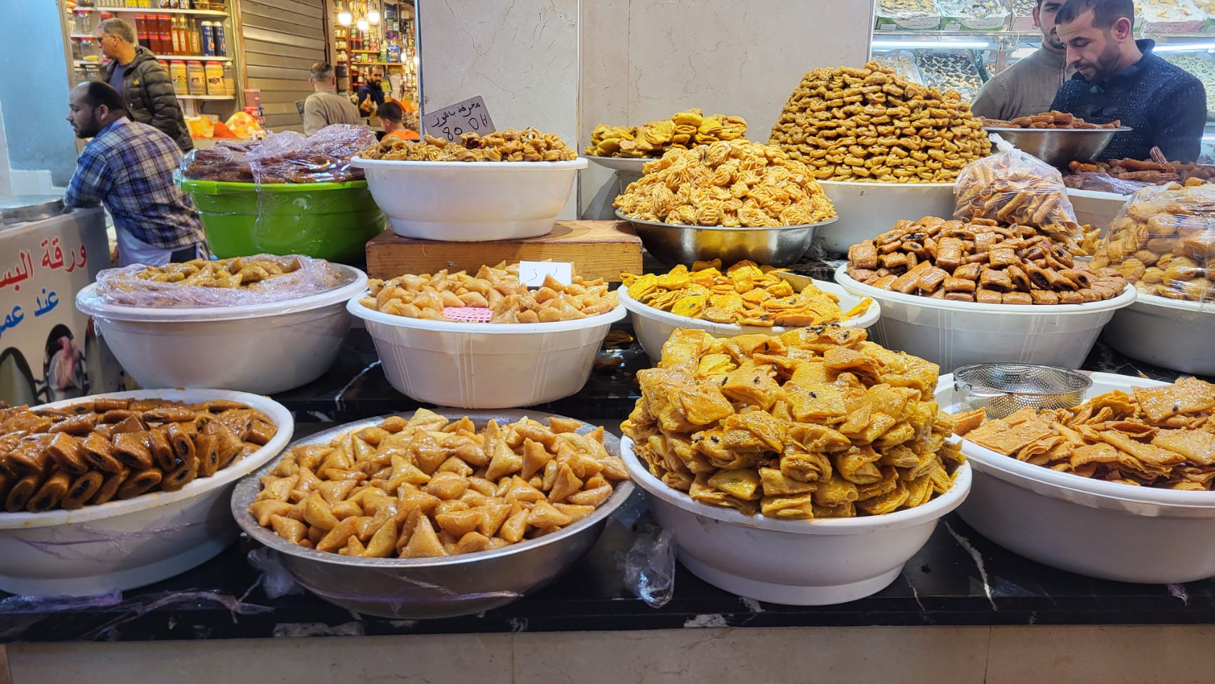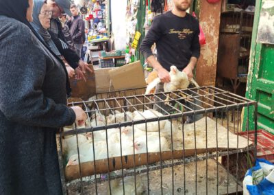 We volgen daarna de oprijlaan van 1 km lang naar zijn voormalige paleis. Geen mooie bomen langs de oprijlaan, maar aan weerskanten 15 meter hoge muren. De muren lopen geheel om het paleizencomplex heen, waar overigens niets meer van over is. Er is nu een golfbaan en een ontoegankelijk militair terrein. We bezoeken de souk met levensmiddelen. Er worden vele soorten koekjes verkocht die soms zwart zien van de wespen die ook wel van de zoetigheid houden. Ook worden er levende kippen verkocht. We vullen onze notenvoorraad aan voor de fietstocht morgen.