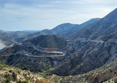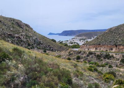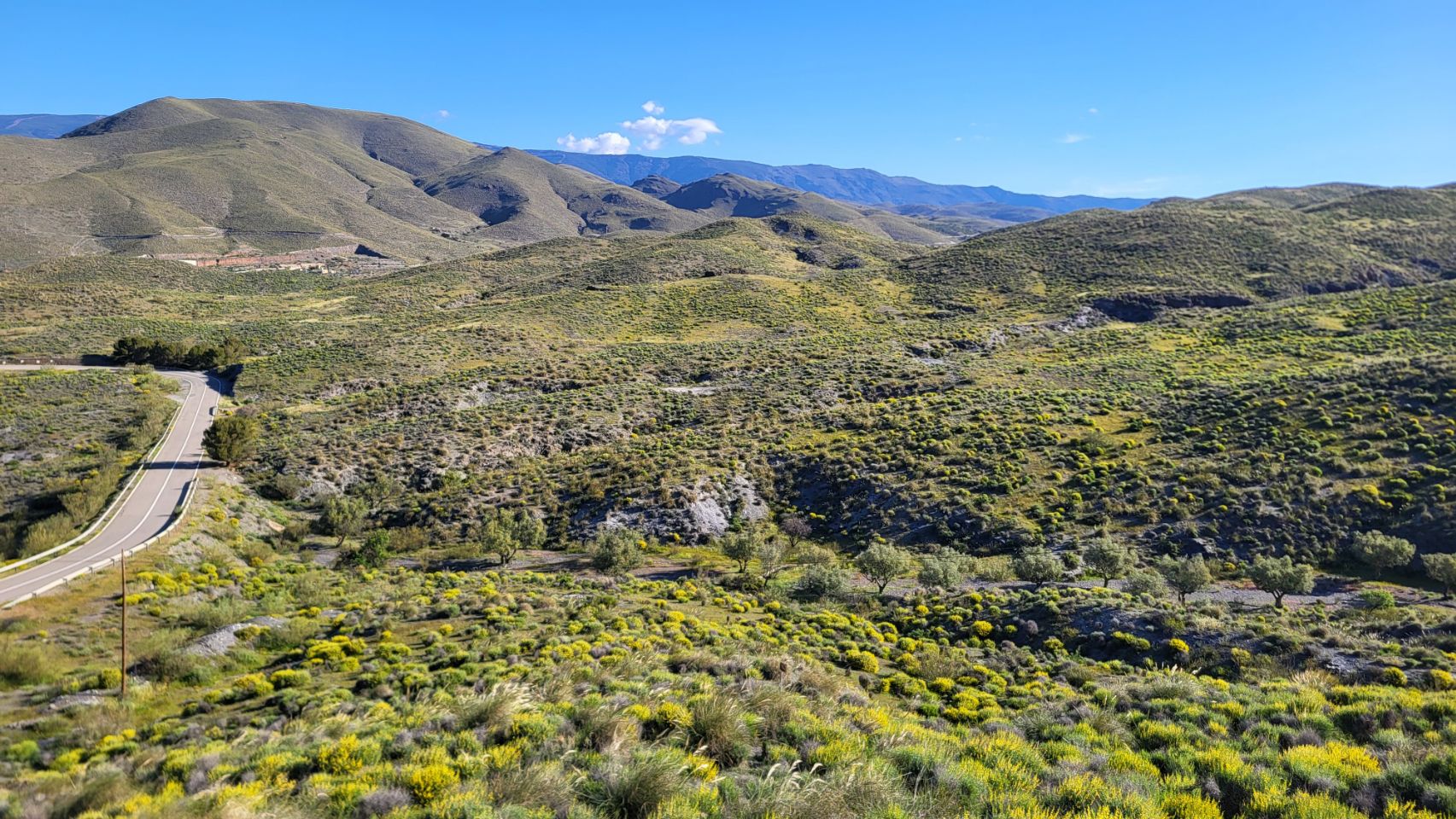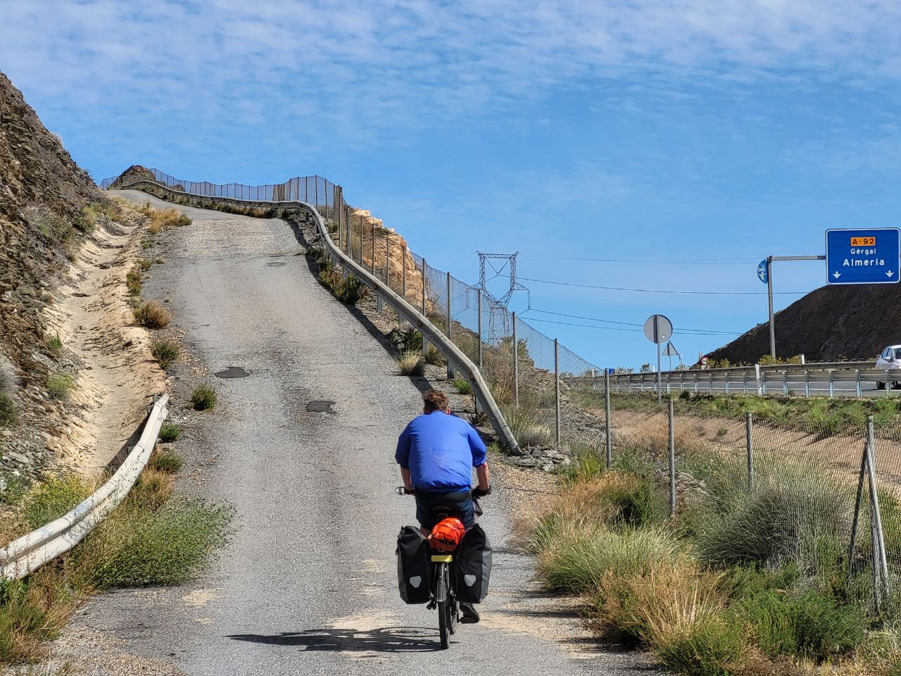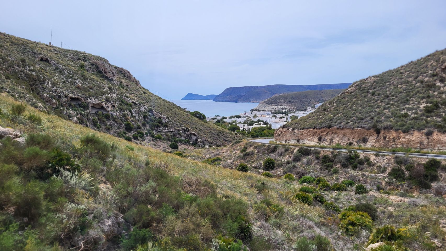 We verheugen ons op deze fietsdag. Even een stukje klimmen naar de top en dan de rest van de 65 km bijna alleen maar dalen tot we aan de kust bij Almería zijn, waar we langs zee naar het kustdorpje Gabo de Gata zullen doorfietsen om daar twee dagen te blijven. We fietsen ons witte bergdorpje uit door prachtig gebergte met graspollen en lage brem.