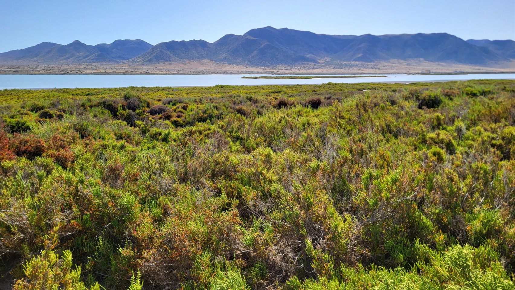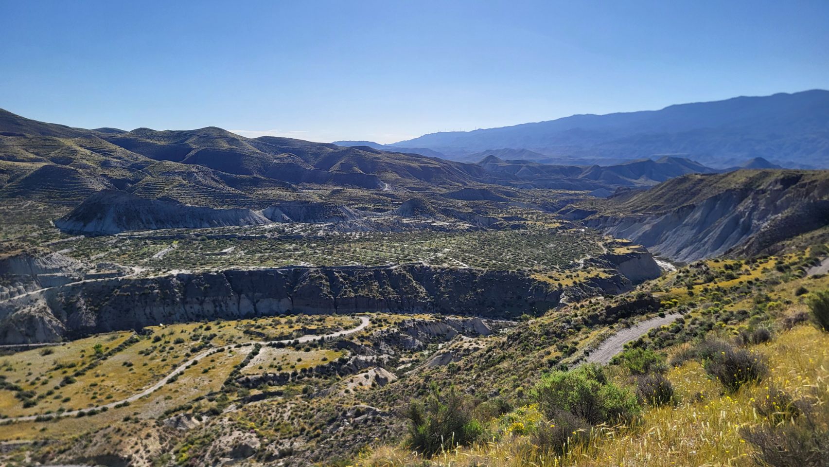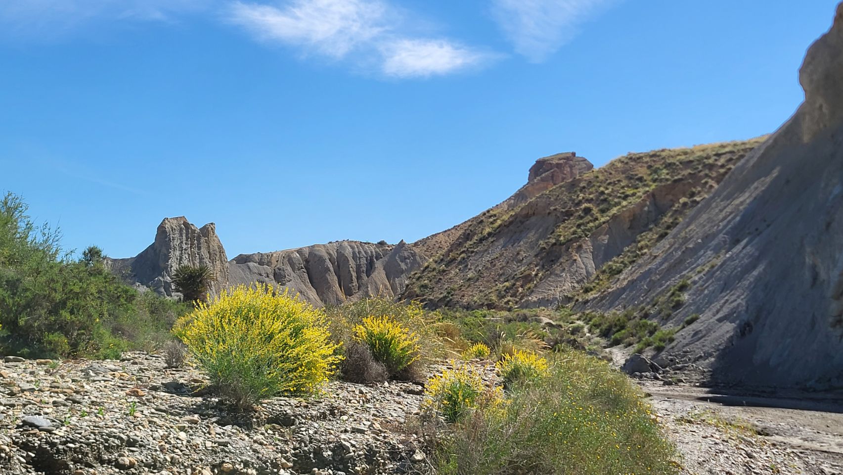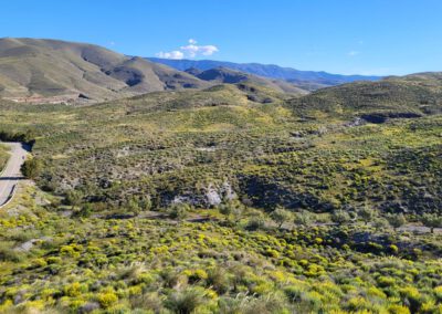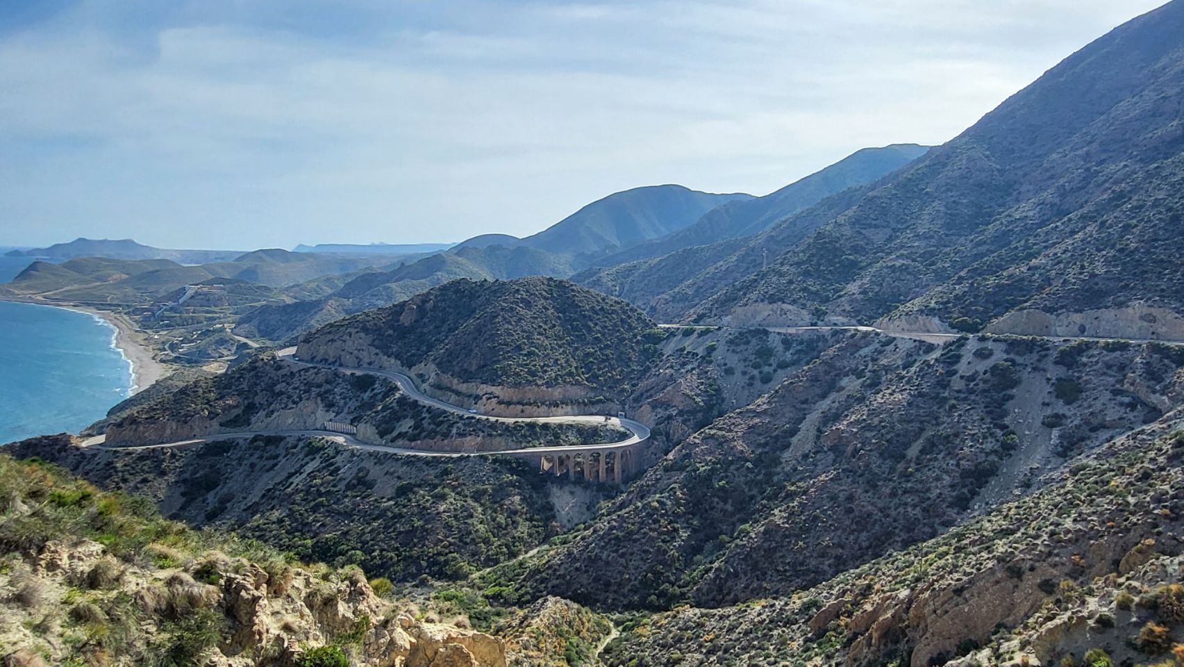 We verheugen ons op deze fietsdag. Even een stukje klimmen naar de top en dan de rest van de 65 km bijna alleen maar dalen tot we aan de kust bij Almería zijn, waar we langs zee naar het kustdorpje Gabo de Gata zullen doorfietsen om daar twee dagen te blijven. We fietsen ons witte bergdorpje uit door prachtig gebergte met graspollen en lage brem.