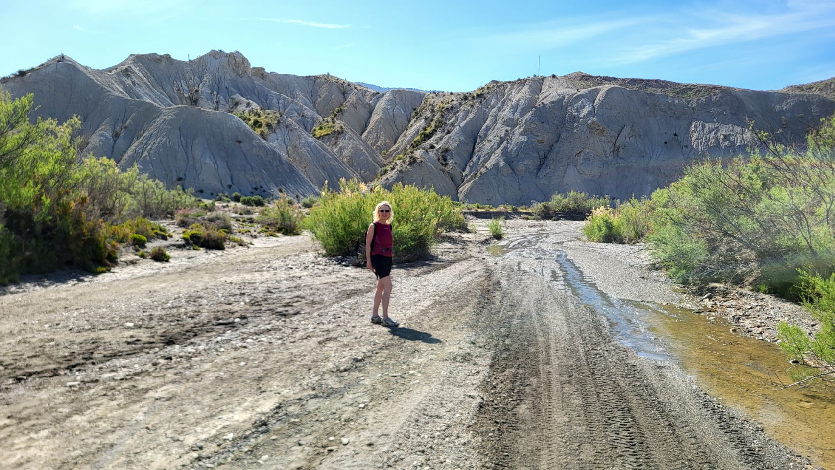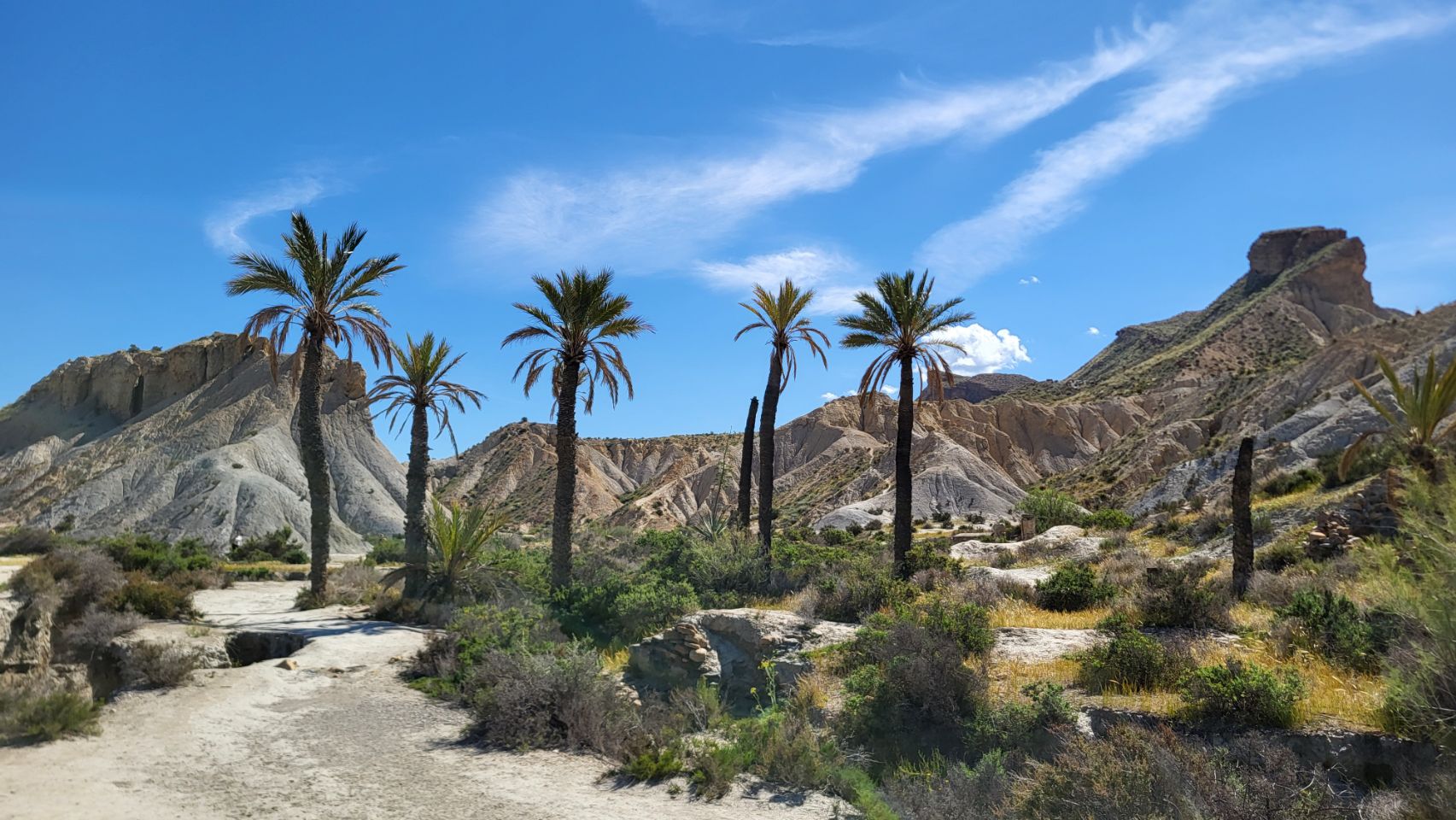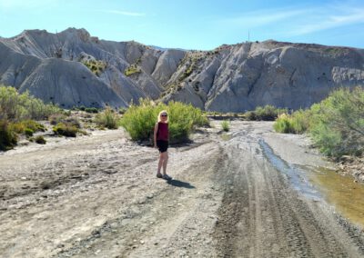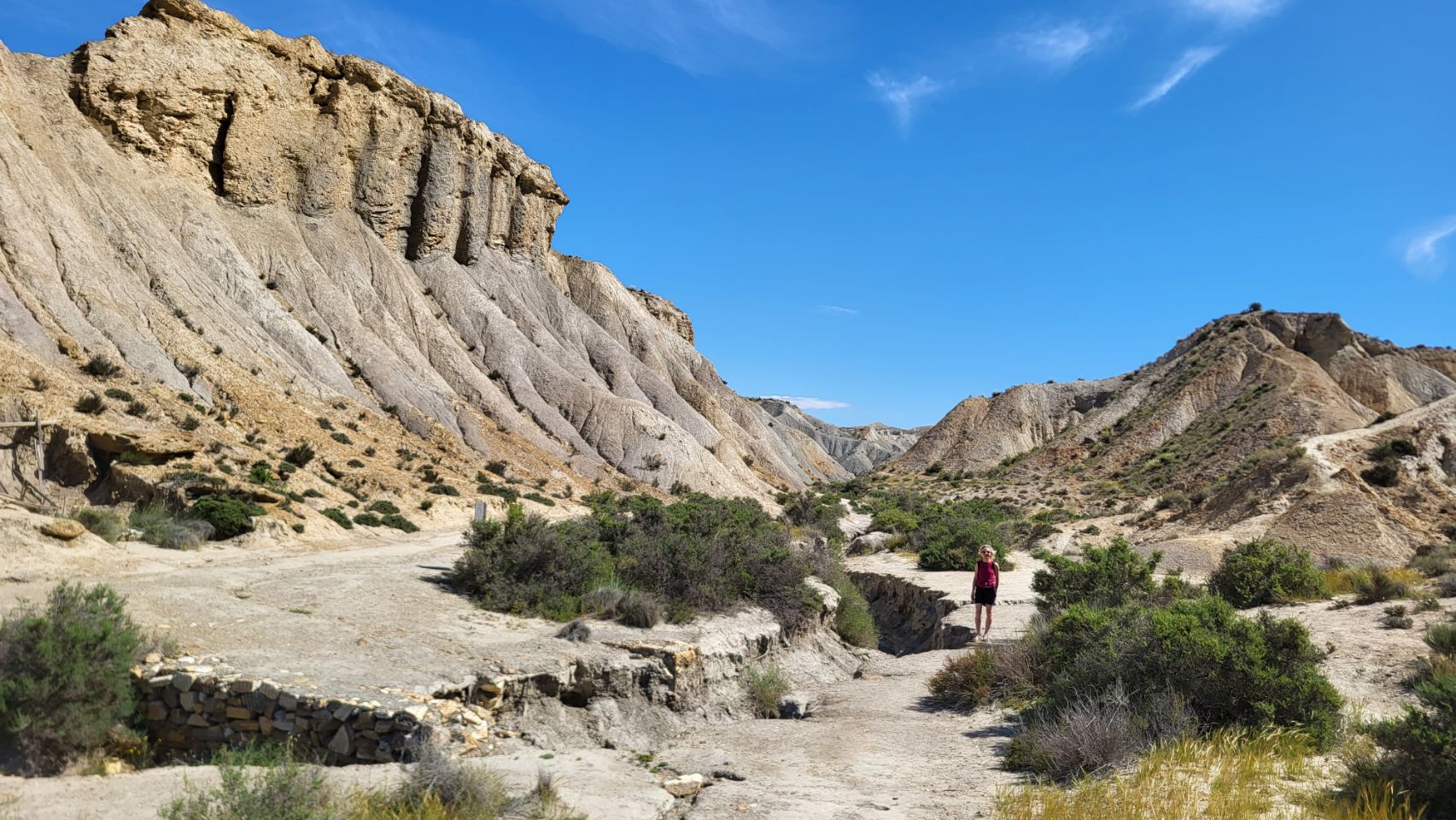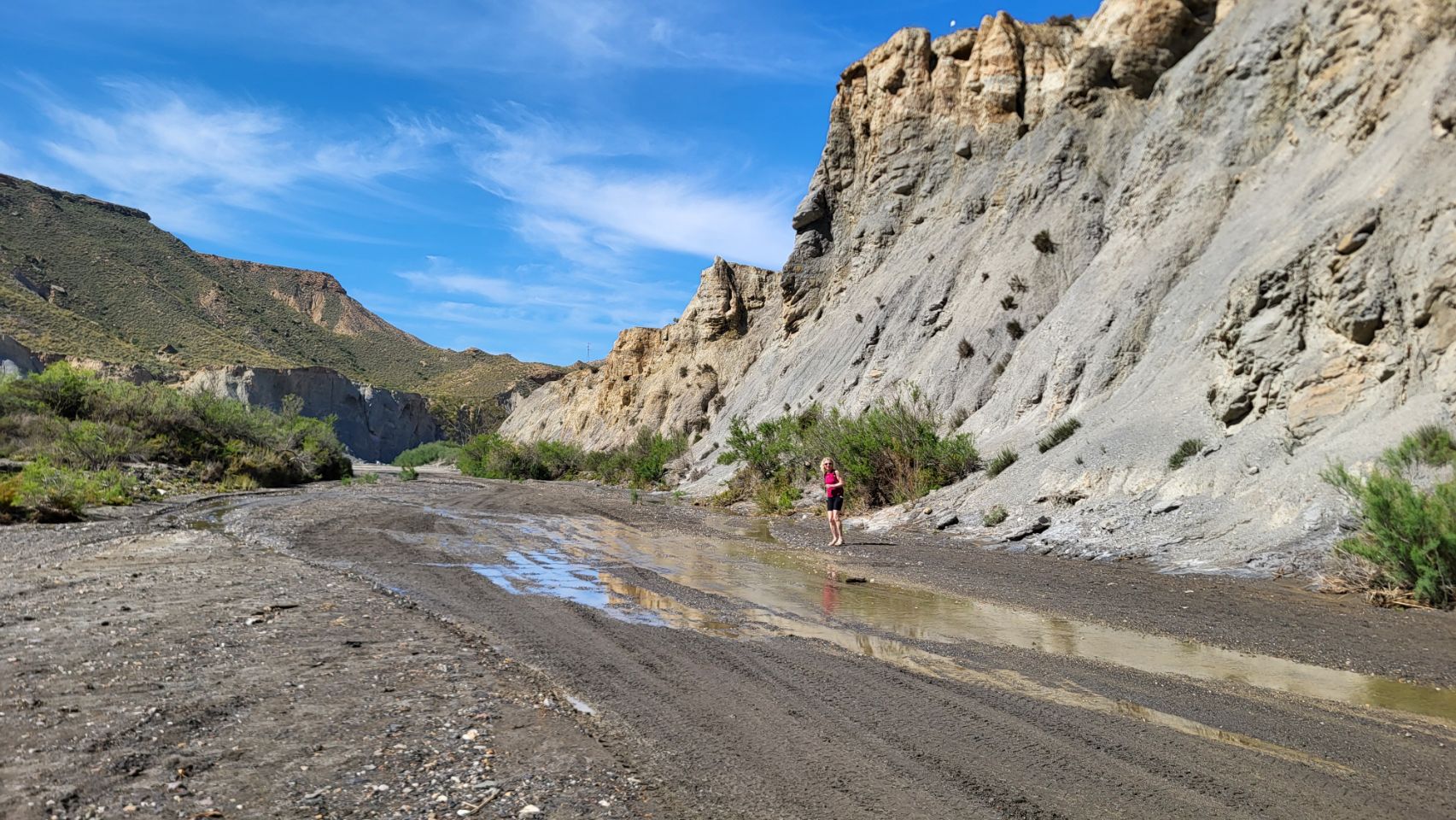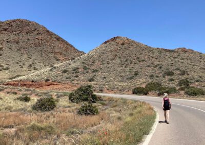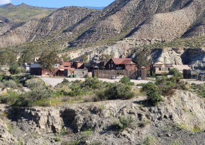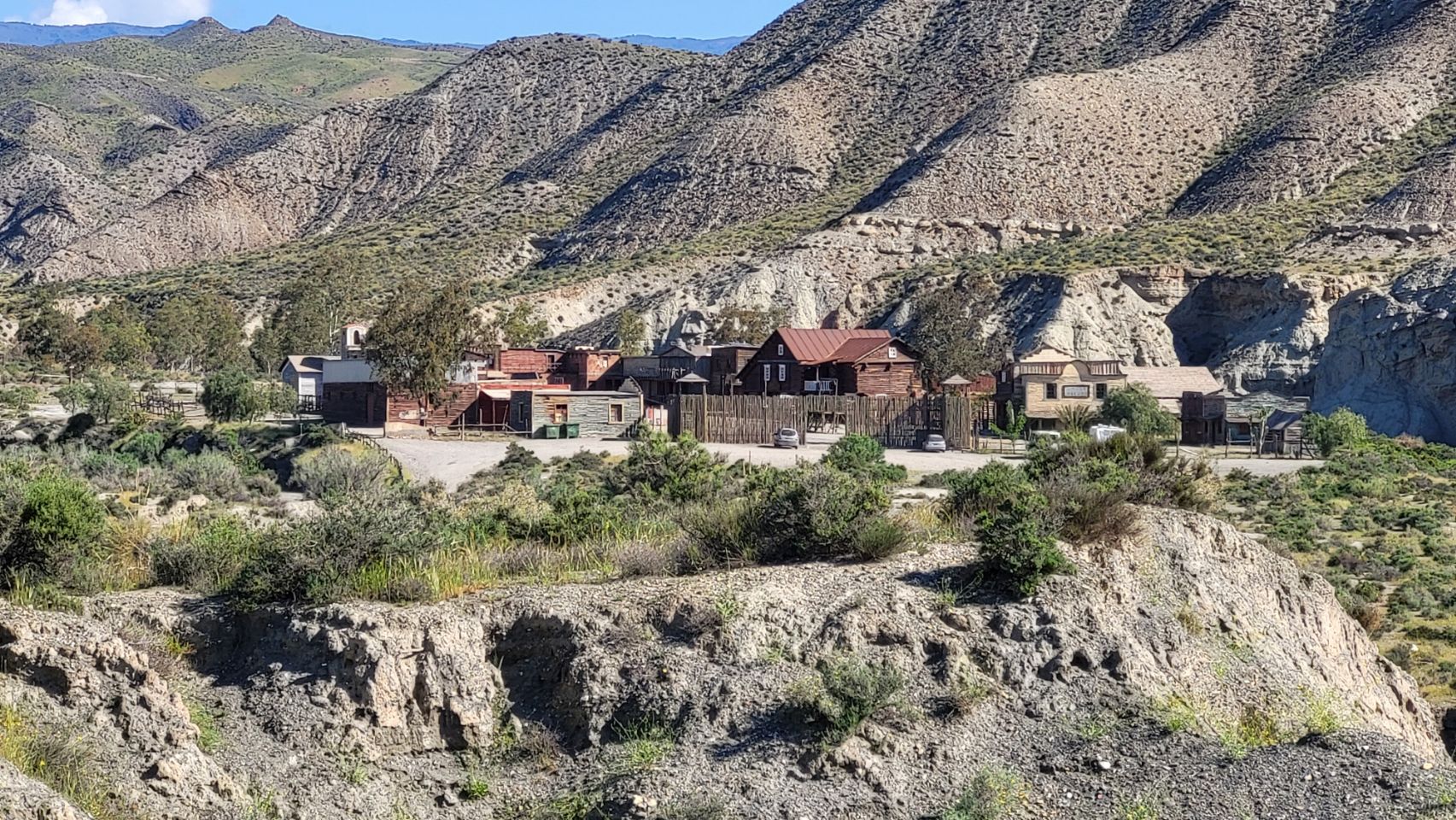 Verderop gaan we dwars door de Desierto de Taberna. Woest is het er wel maar bij een woestijn hebben wij doorgaans andere beelden. Het is echt een landschap zoals je ze in Westerns ziet en dat is dan ook de reden dat regiseurs op deze locatie neerstreken om beroemde films op te nemen, zoals The good, the bad and the ugly. Je kan de gebouwde cowboydorpjes nog zien en er worden shows gegeven. Wij vinden vooral het landschap interessant. We parkeren onze fietsen met bagage op een afgelegen plek waar geen auto’s mogen komen, dus daar zullen ze niet ingeladen worden.