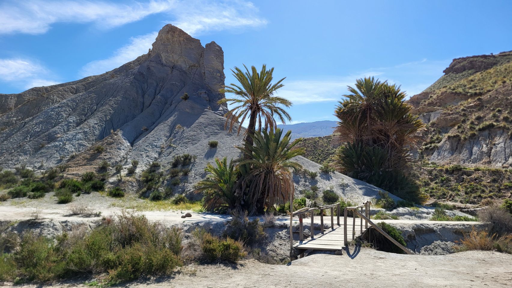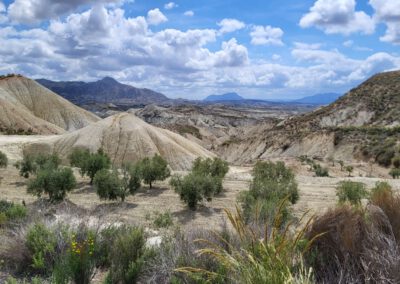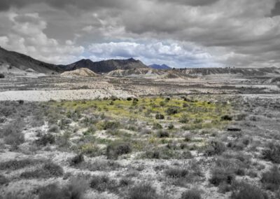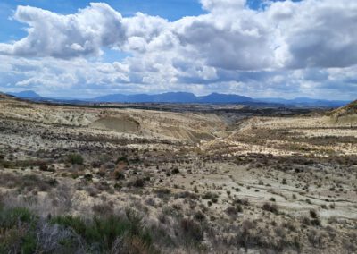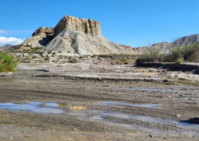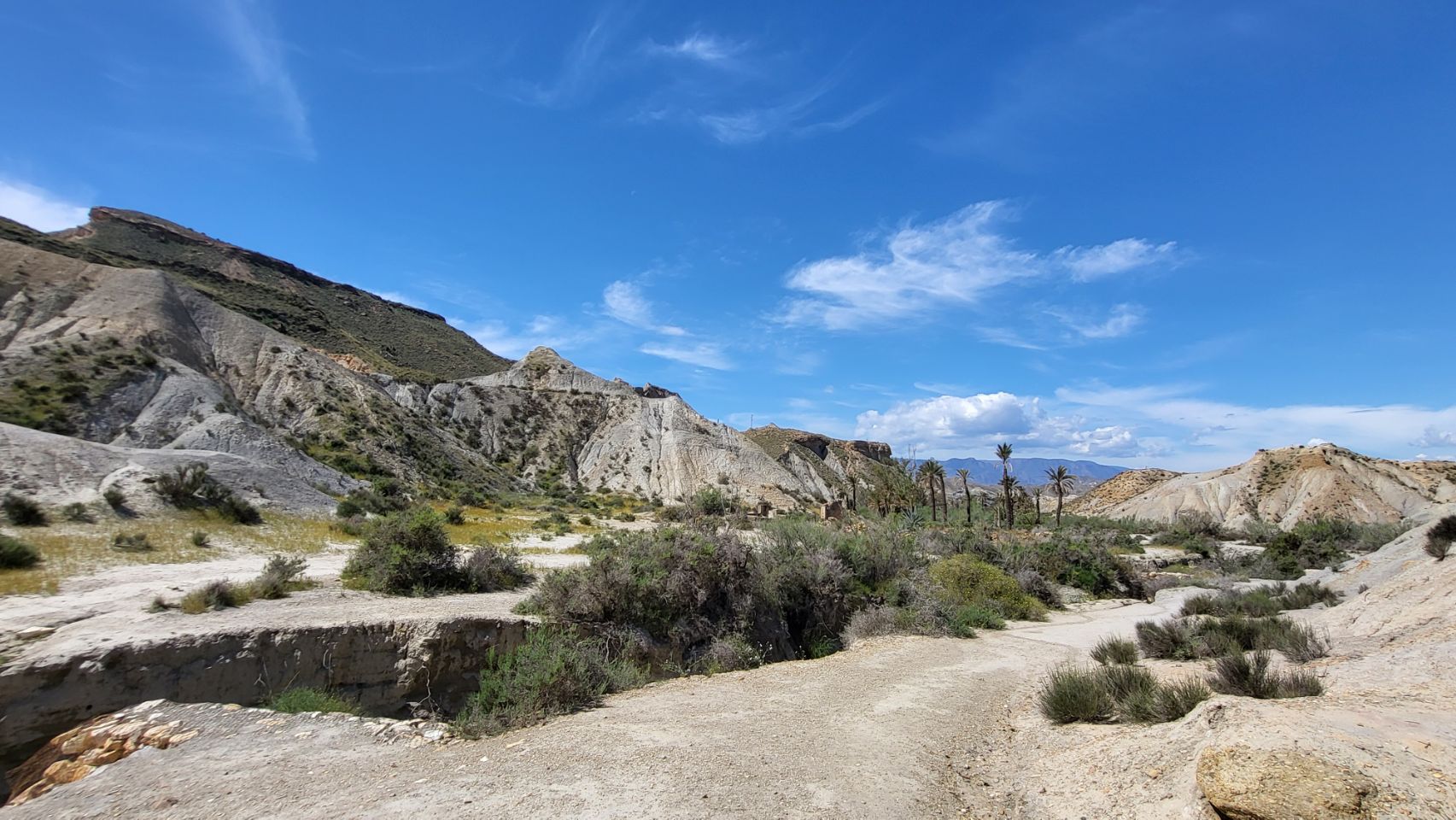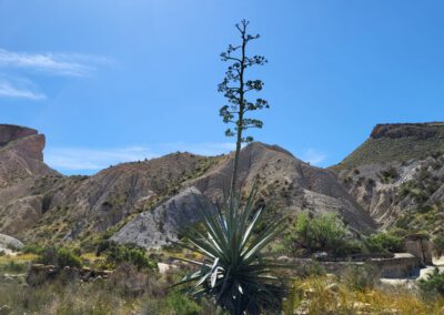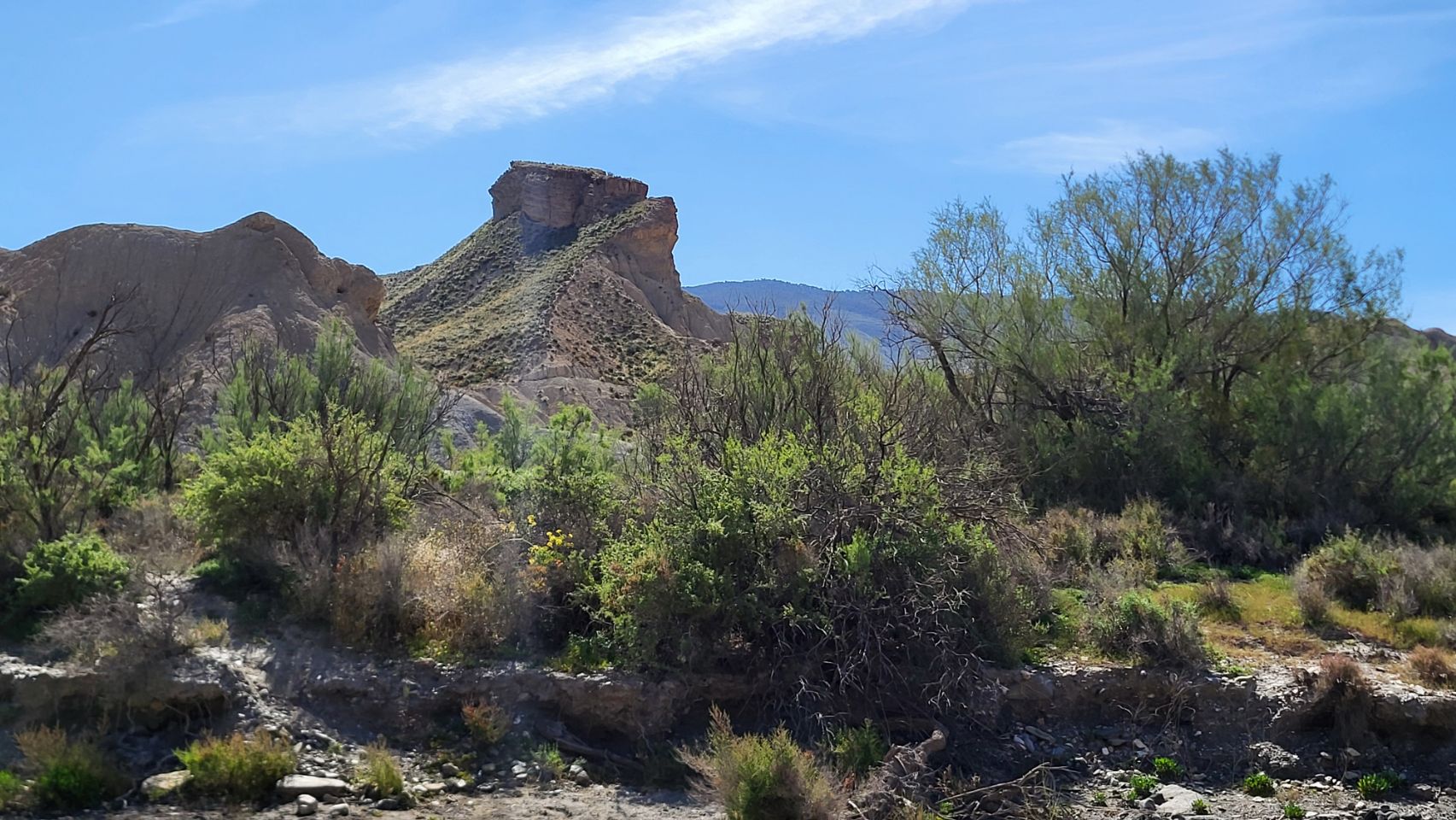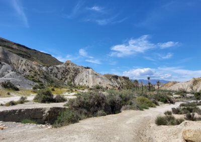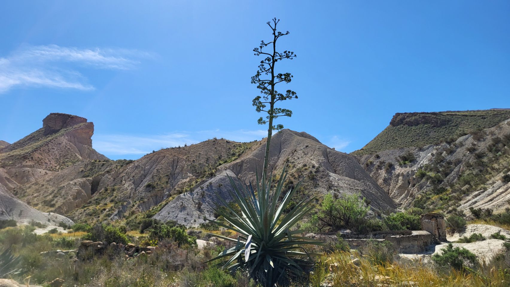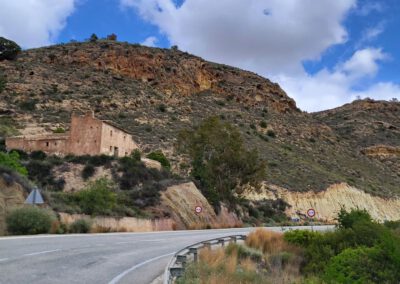 Verderop gaan we dwars door de Desierto de Taberna. Woest is het er wel maar bij een woestijn hebben wij doorgaans andere beelden. Het is echt een landschap zoals je ze in Westerns ziet en dat is dan ook de reden dat regiseurs op deze locatie neerstreken om beroemde films op te nemen, zoals The good, the bad and the ugly. Je kan de gebouwde cowboydorpjes nog zien en er worden shows gegeven. Wij vinden vooral het landschap interessant. We parkeren onze fietsen met bagage op een afgelegen plek waar geen auto’s mogen komen, dus daar zullen ze niet ingeladen worden.