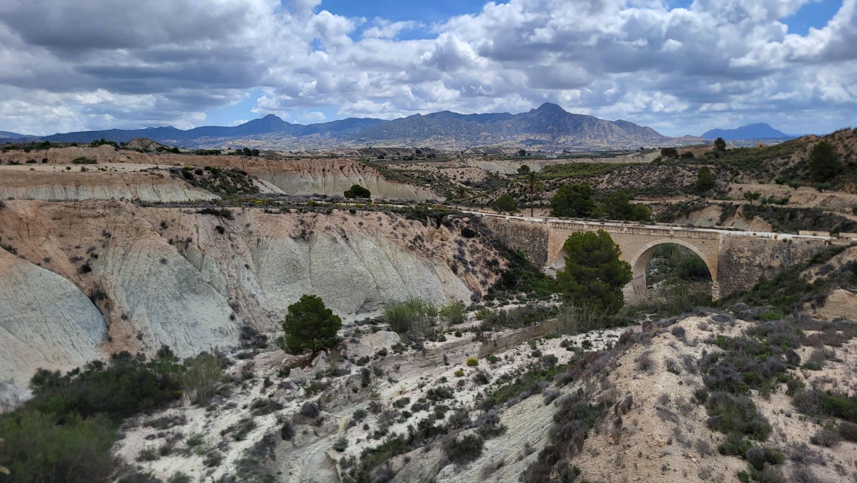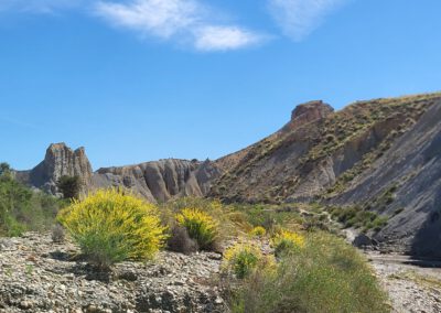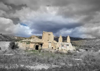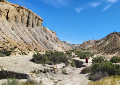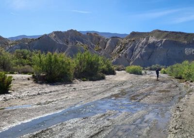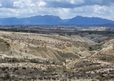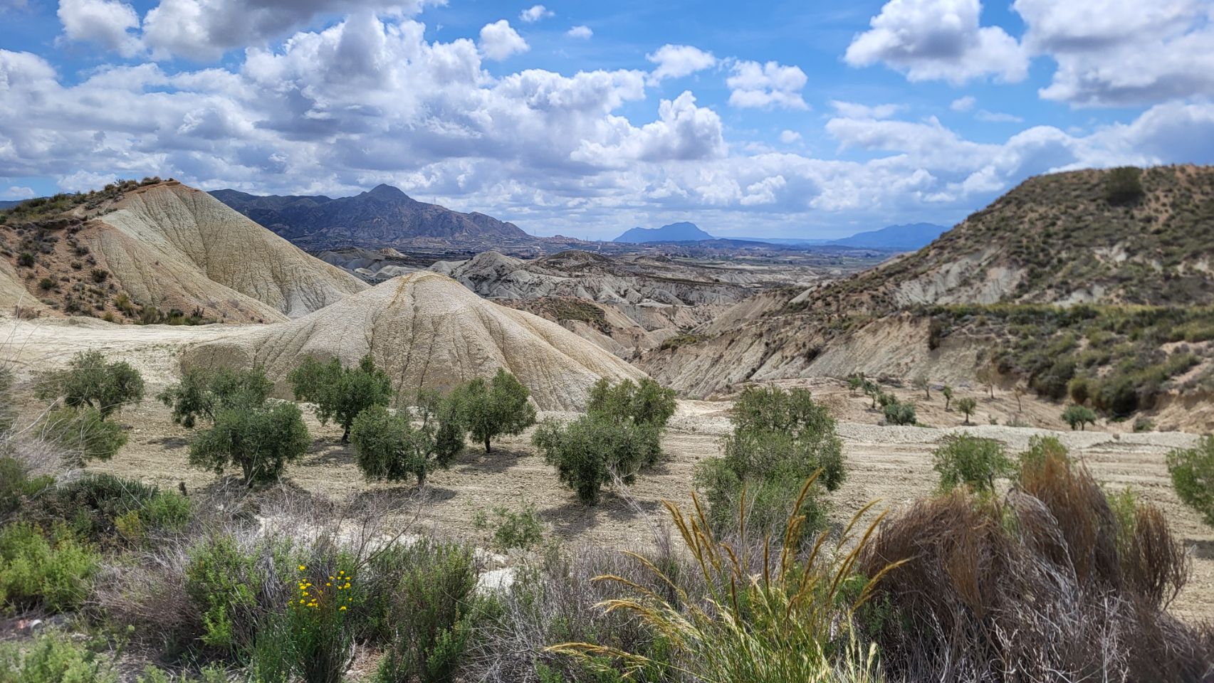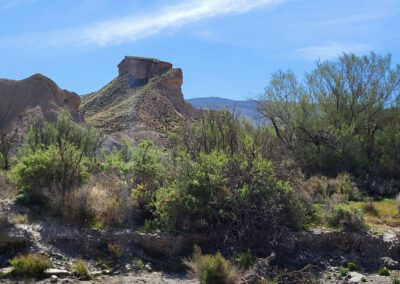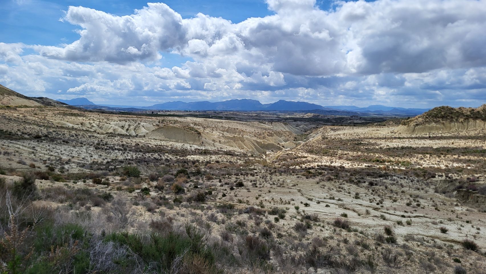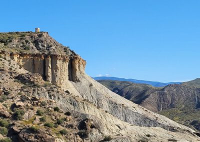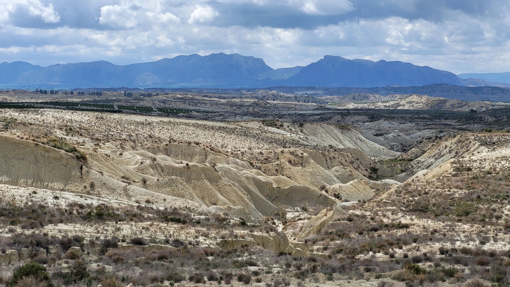 Verderop gaan we dwars door de Desierto de Taberna. Woest is het er wel maar bij een woestijn hebben wij doorgaans andere beelden. Het is echt een landschap zoals je ze in Westerns ziet en dat is dan ook de reden dat regiseurs op deze locatie neerstreken om beroemde films op te nemen, zoals The good, the bad and the ugly. Je kan de gebouwde cowboydorpjes nog zien en er worden shows gegeven. Wij vinden vooral het landschap interessant. We parkeren onze fietsen met bagage op een afgelegen plek waar geen auto’s mogen komen, dus daar zullen ze niet ingeladen worden.