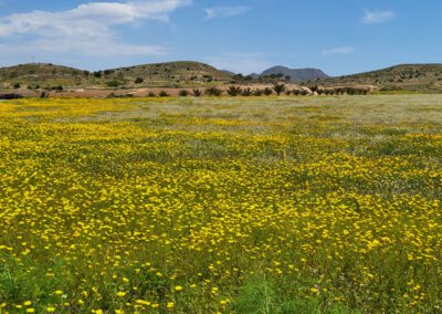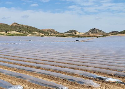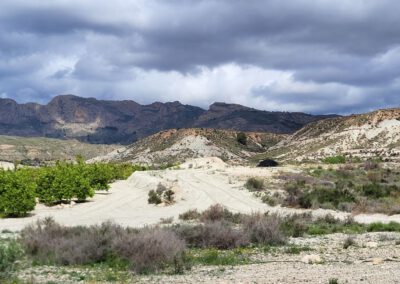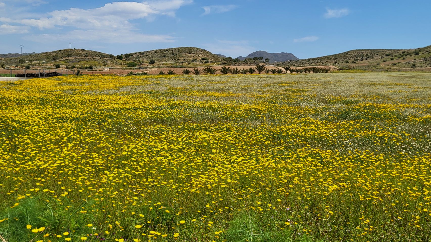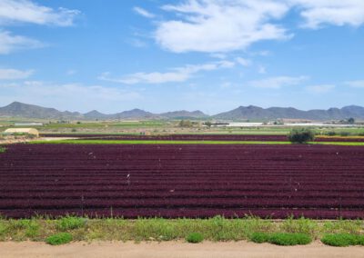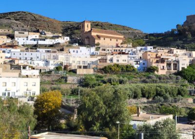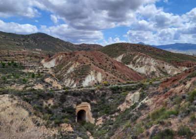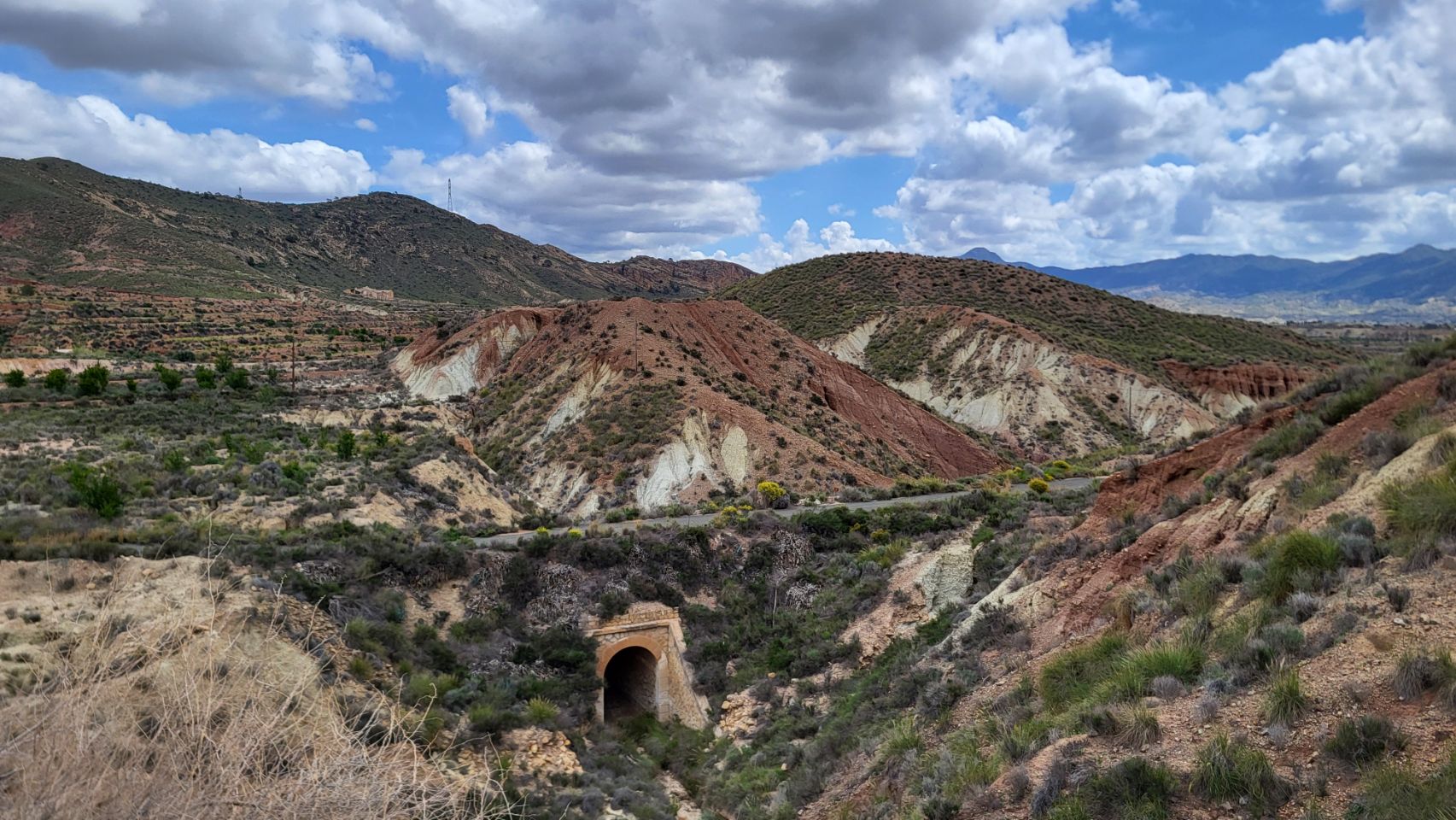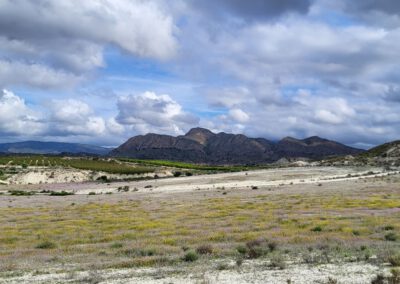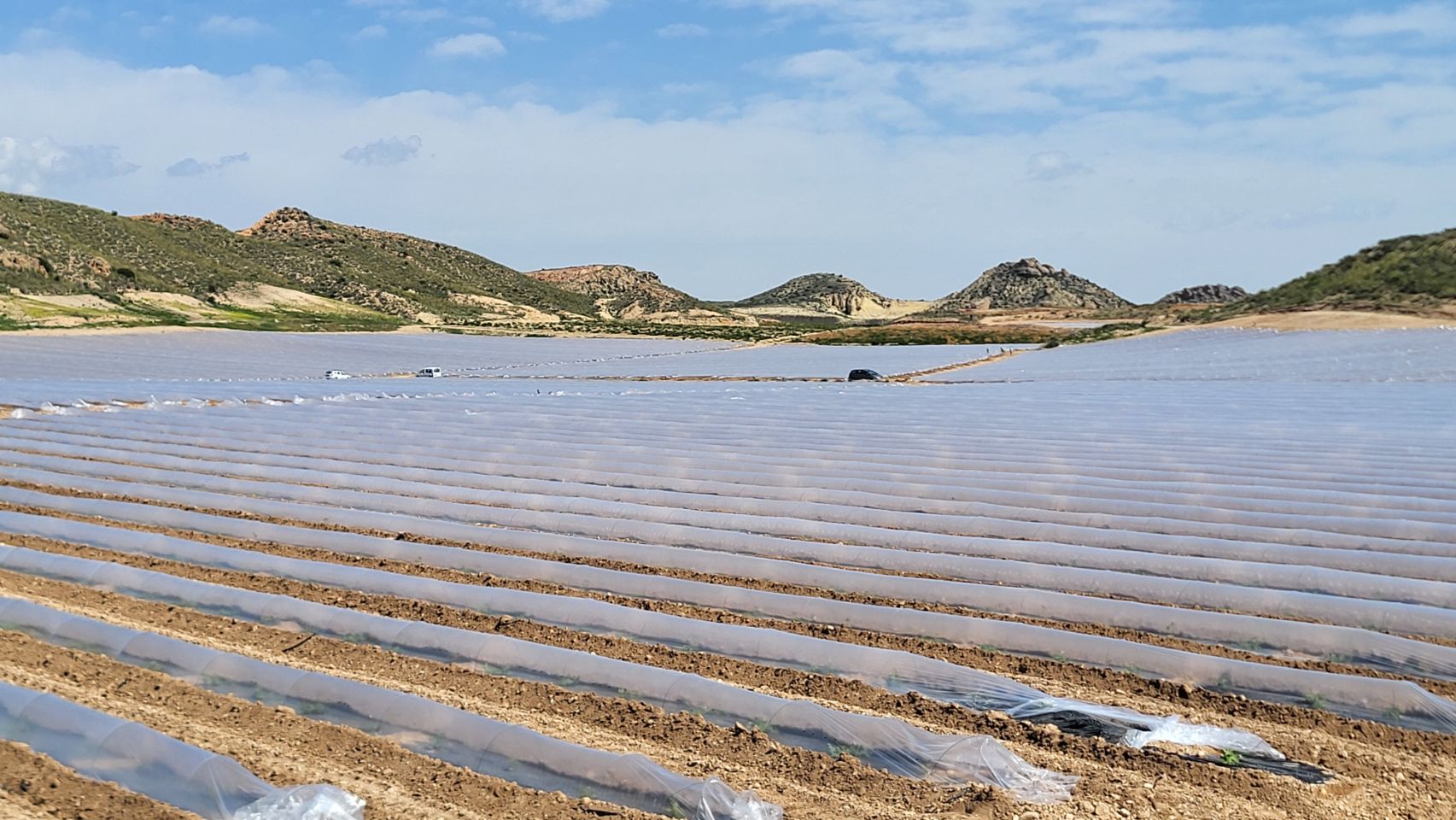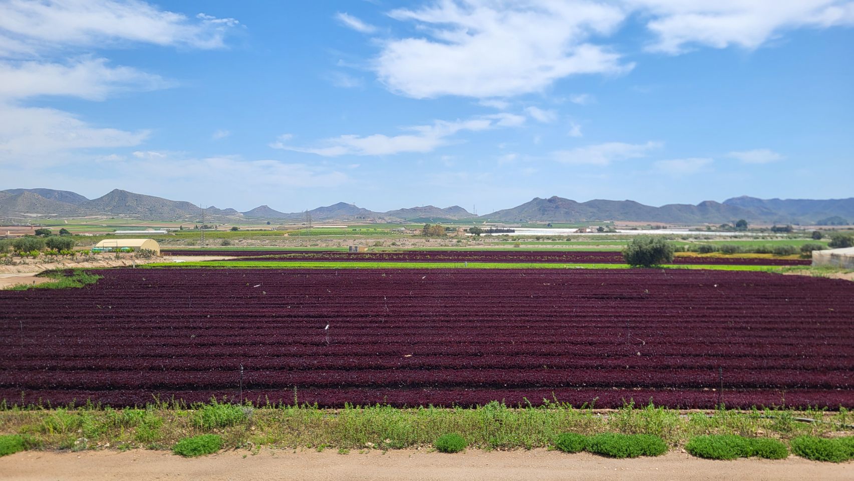 We trekken verder, 76 km noordwaarts en weer van de kust af. De route is afwisselend: tuinbouw, dorpen, groen, bergen en bloemen. Hier zien we teelten in de open lucht, zoals sla. Ook halfopen kassen met druiven. Meloenplanten staan in gaten in zwart plastic onder smalle folietunnels voor een quickstart om zo het seizoen te vervroegen. In totaal is er in deze regio Almería 33.000 ha tuinbouw, dicht op elkaar.
