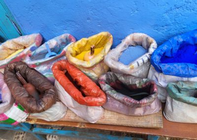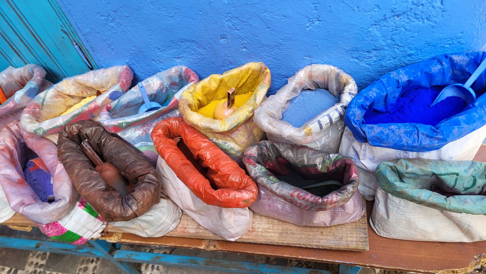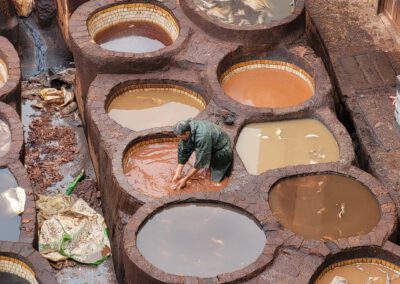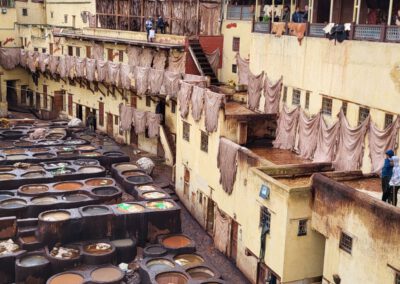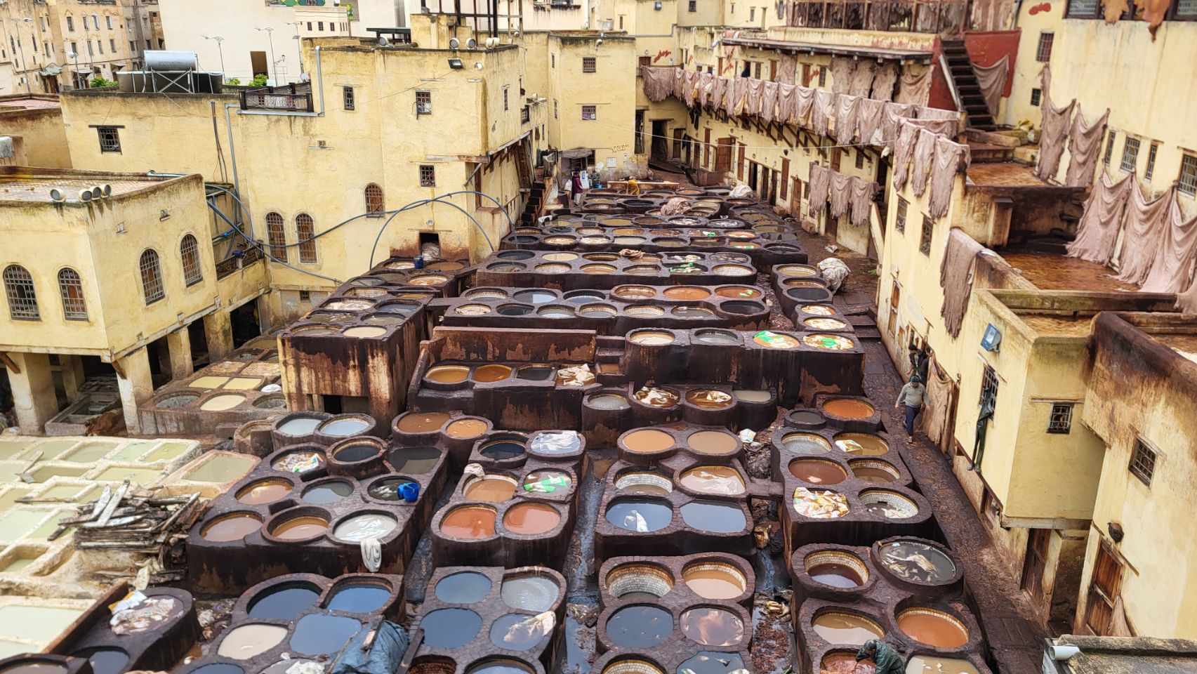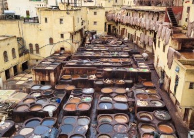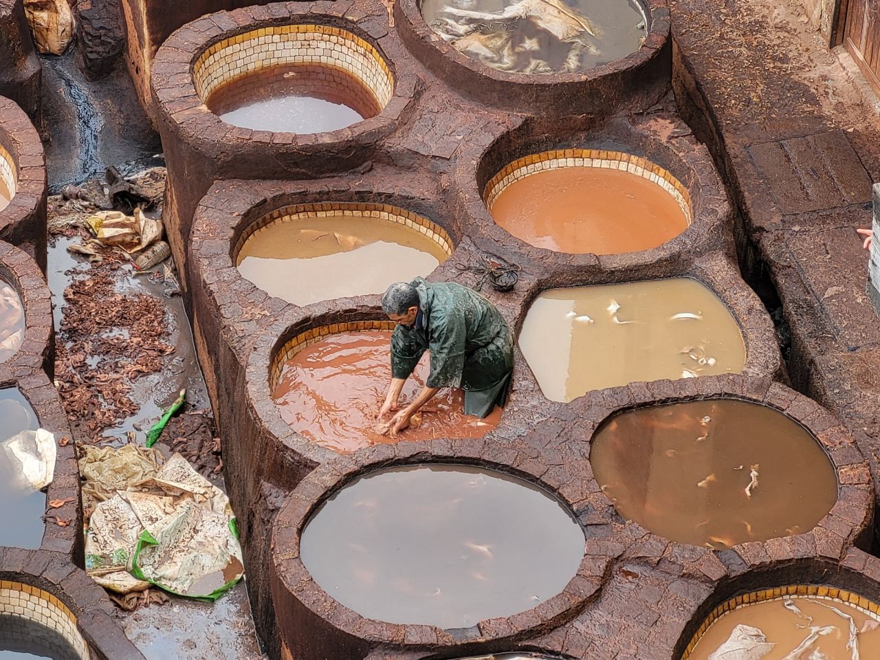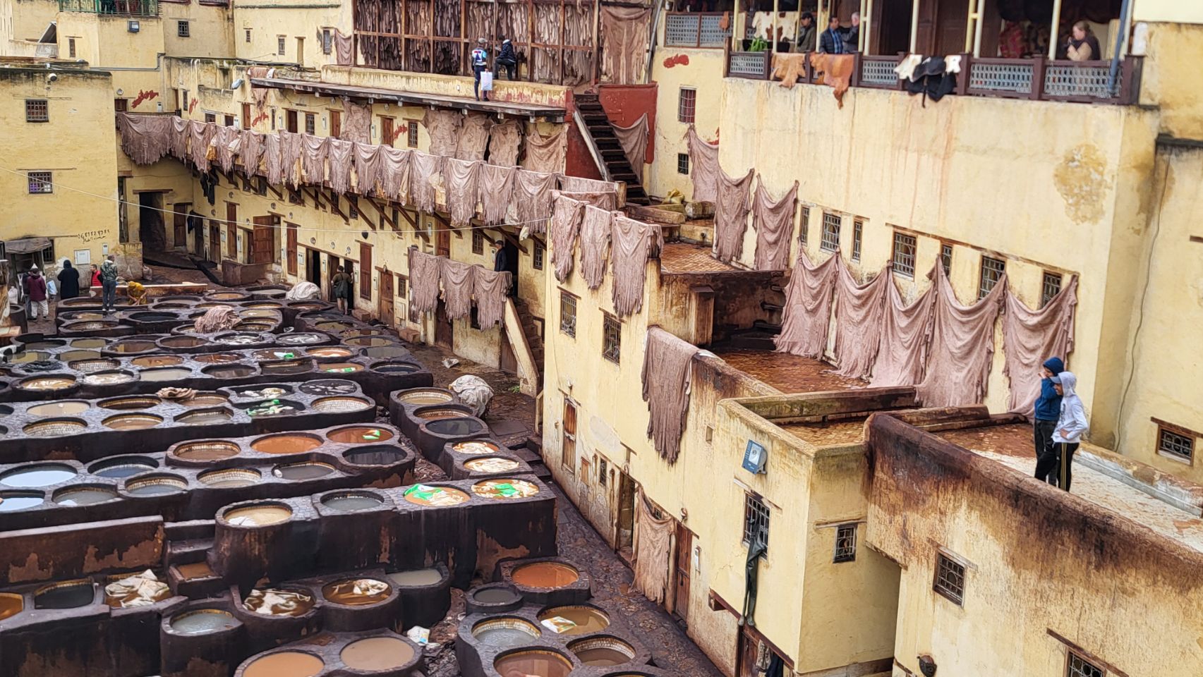 Omdat we geen overnachting hebben kunnen vinden op het traject van 190 km door de bergen noordwaarts naar Chefchaouan, gaan we de bus daarheen regelen. De rest van de dag verkennen we de medina van Fez. Eigenlijk zijn we al een beetje medinamoe, maar we willen in elk geval de leerlooierij zien. Deze bestaat al sinds de 11e eeuw op deze locatie toen ook de stad Fez werd gebouwd. Nog steeds worden de huiden van schapen, koeien, geiten, kamelen, ezels en paarden hier op dezelfde traditionele manier bewerkt en geverfd. De huiden worden eerst geweekt in kalkwater waaraan duivenmest en urine is toegevoegd. De duivenmest en de urine bevatten natuurlijke ammoniak waar de huiden zacht van worden en vet en haar gemakkelijk kan worden verwijderd.