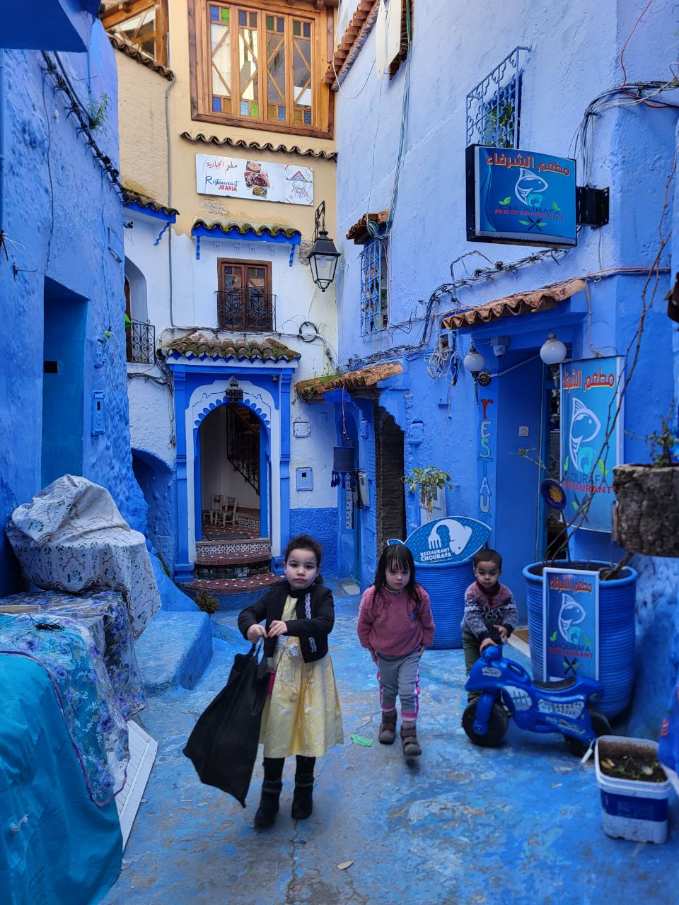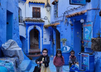 Chefchaouen is beroemd vanwege de in blauwtinten geverfde huizen, met name in de medina, het oude stadscentrum. We hebben een prachtige kamer in een riad in de medina en dat voor maar 35 euro per nacht. Wat een heerlijk relaxte omgeving, na de hectiek van Meknes en Fes. We besluiten hier drie nachten te blijven. Het koelt na zonsondergang snel af tot ruim onder de 10 graden. Hier in Marokko zijn alle restaurants en koffiehuizen heel erg open. De deuren en ramen staan open, of heel de voorgevel is open. Binnen zitten is dus altijd half buiten zitten, zomer of winter, warm of koud. We hebben geen winterjas bij ons dus zoeken net zo lang tot we een restaurantje vinden die ook een paar tafeltjes achter een gesloten deur heeft.