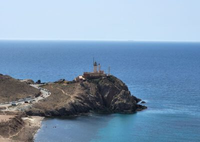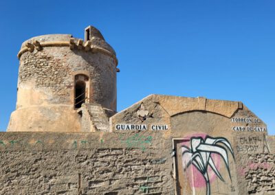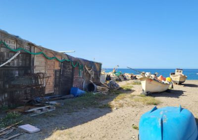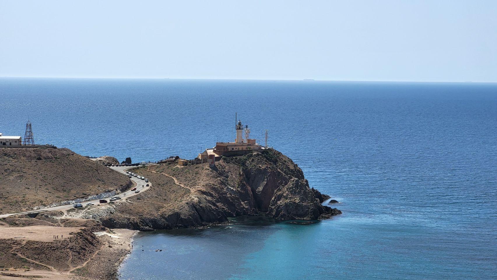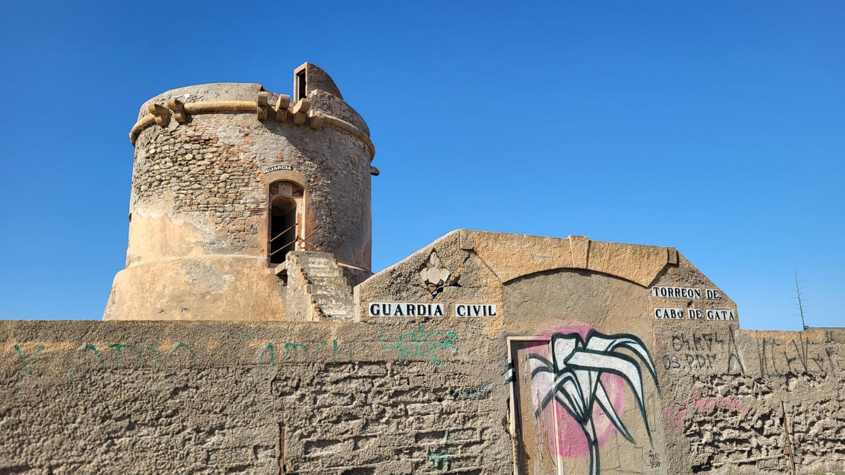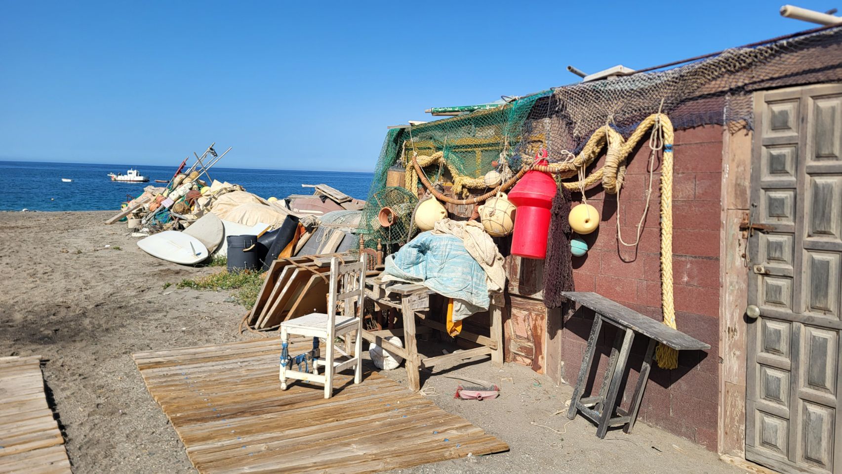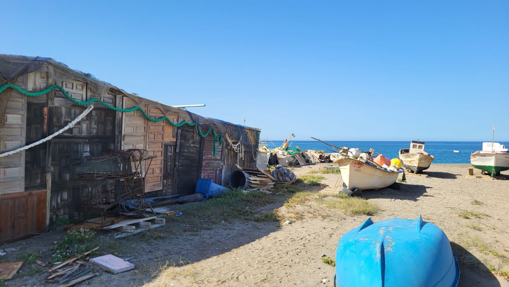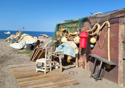 Het is tijd om de omgeving eens wat meer te gaan verkennen. De kust bij de meest zuidelijke punt moet mooi zijn, met uitlopers van de omliggende bergen van gestold lava eindigend in de zee. We fietsen Cabo de Gata uit en passeren oude vissersbootjes op het strand en uit oude deuren opgetrokken gebouwtjes vol oud visgerei. Oude vissers hangen er rond, het lijkt er veel op dat de visserij hier vroeger een belangrijke inkomstenbron was.