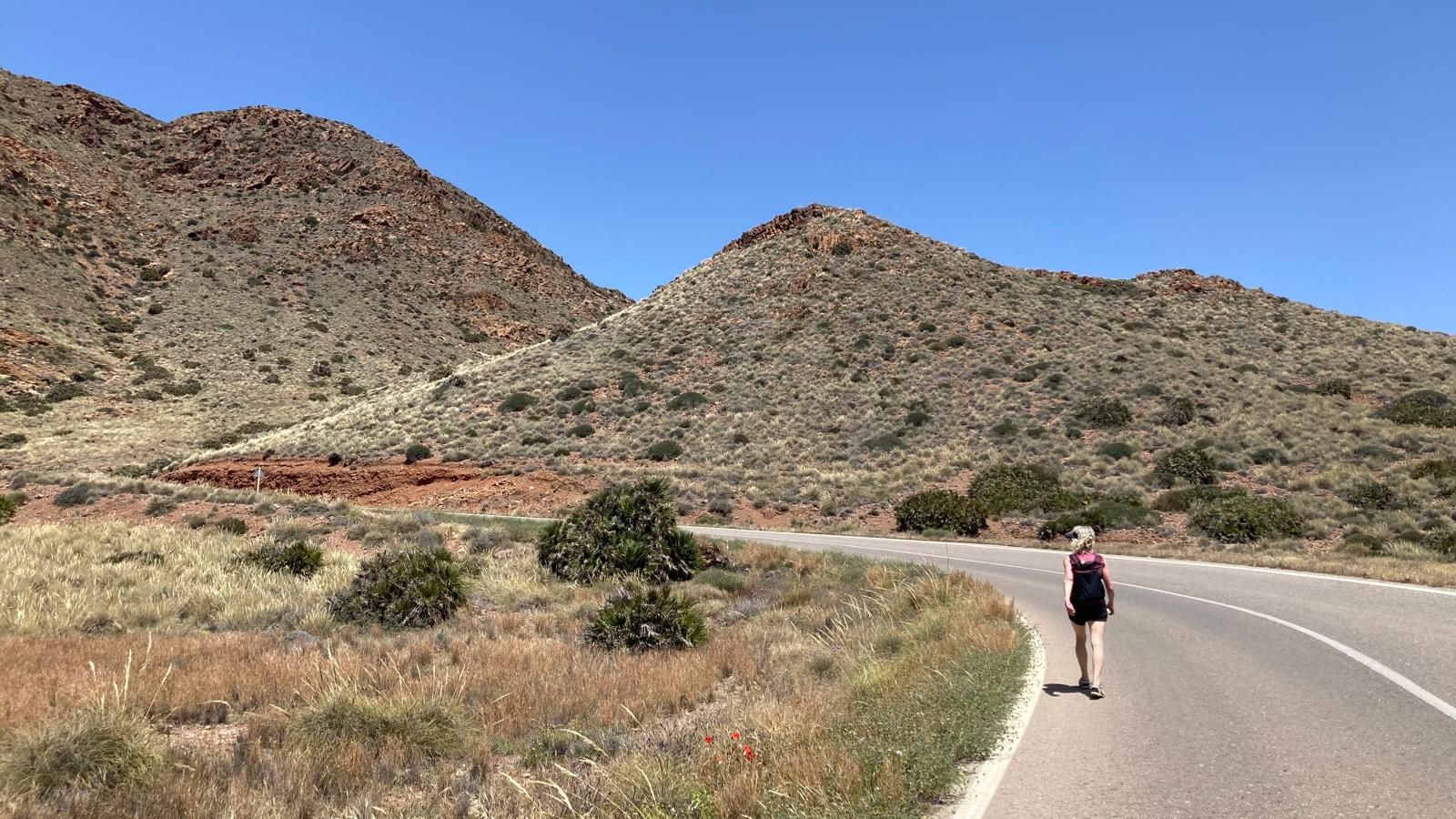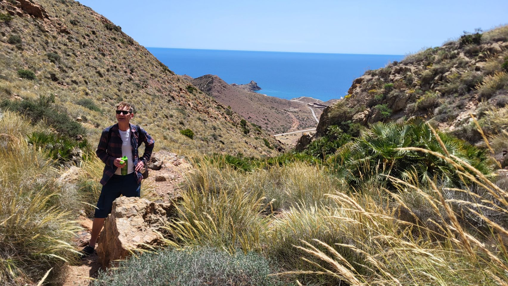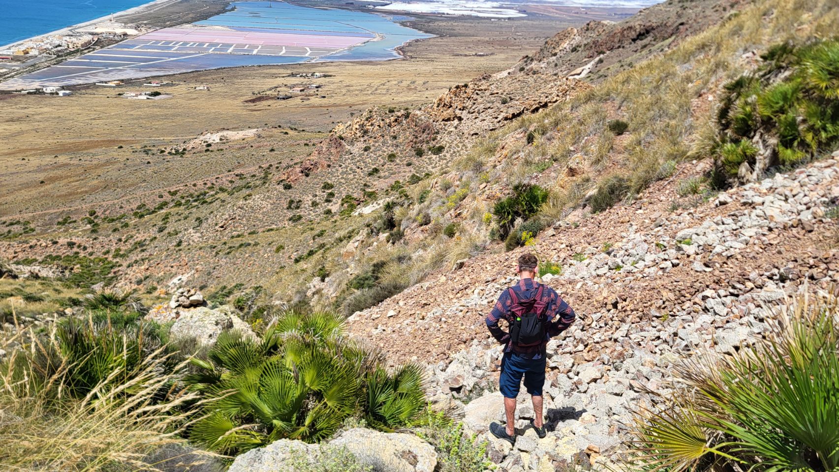 Het water is overigens lekker om te zwemmen, maar voor snorkelen toch wel koud. We drinken een koffie en gaan terug via een pad door de vulkaanbergen. Dat blijkt nog een behoorlijke uitdaging. Het pad is steil en vol losse stenen. Moeilijk te zien ook, maar de navigatie houdt ons op de juiste route. Eenmaal boven hebben we een fantastisch uitzicht op de de zoutpannen. We hebben flink wat hoogtemeters gemaakt en die moeten dus ook weer naar beneden. Op de fiets altijd fijn, lopend een stuk minder. Maar wij houden wel van een beetje klauteren en stappen zo veel mogelijk via de ruwe grotere lavakeien naar beneden. Het is behoorlijk warm geworden en beneden duiken we weer in zee voordat we terug fietsen naar ons dorp. ’s Avonds gaan we wat hotels en treinen boeken op het traject dat we gisteren hebben bepaald. Maar de trein vanuit Almerîa een stuk noordwaarts tot in de bergen is niet te boeken, vol. Daarna kan ook niet omdat er vanwege werkzaamheden bussen worden ingezet. Geen kans dus op vervoer met de fiets, we moeten ons hele plan omgooien en gaan verder via de kust. We gaan daardoor wel een mooie route door de bergen missen helaas.