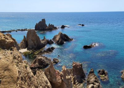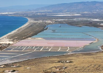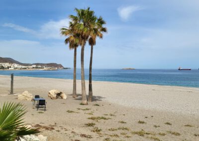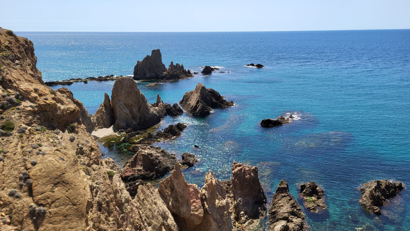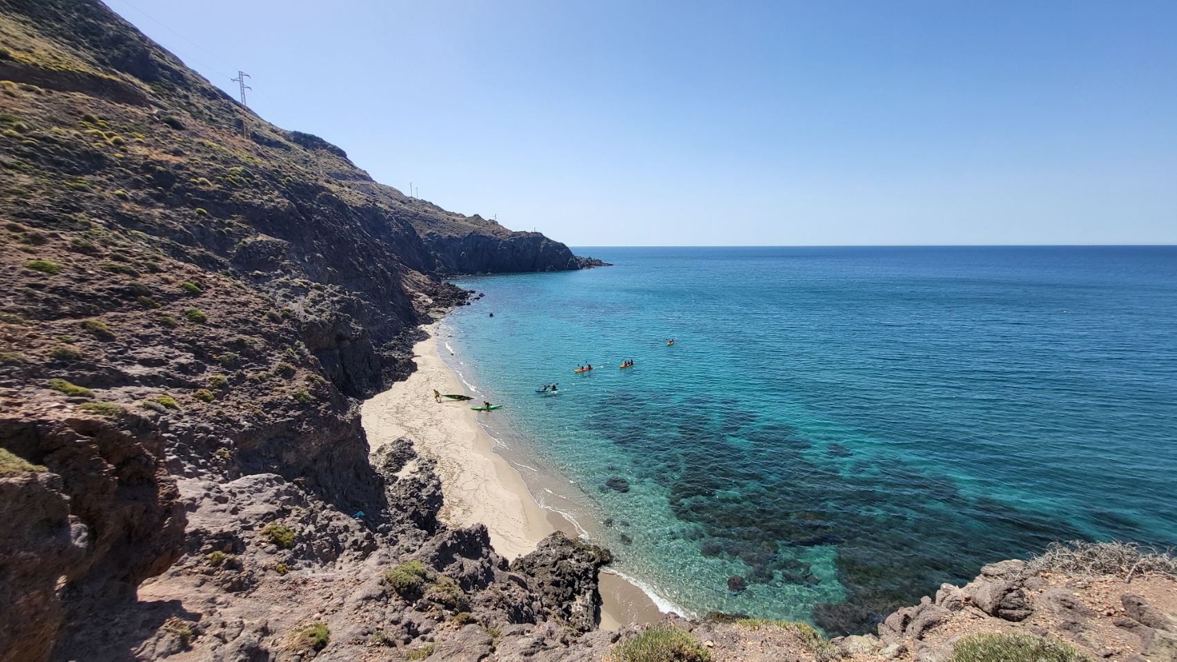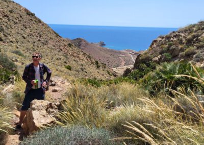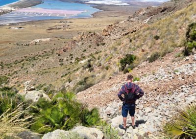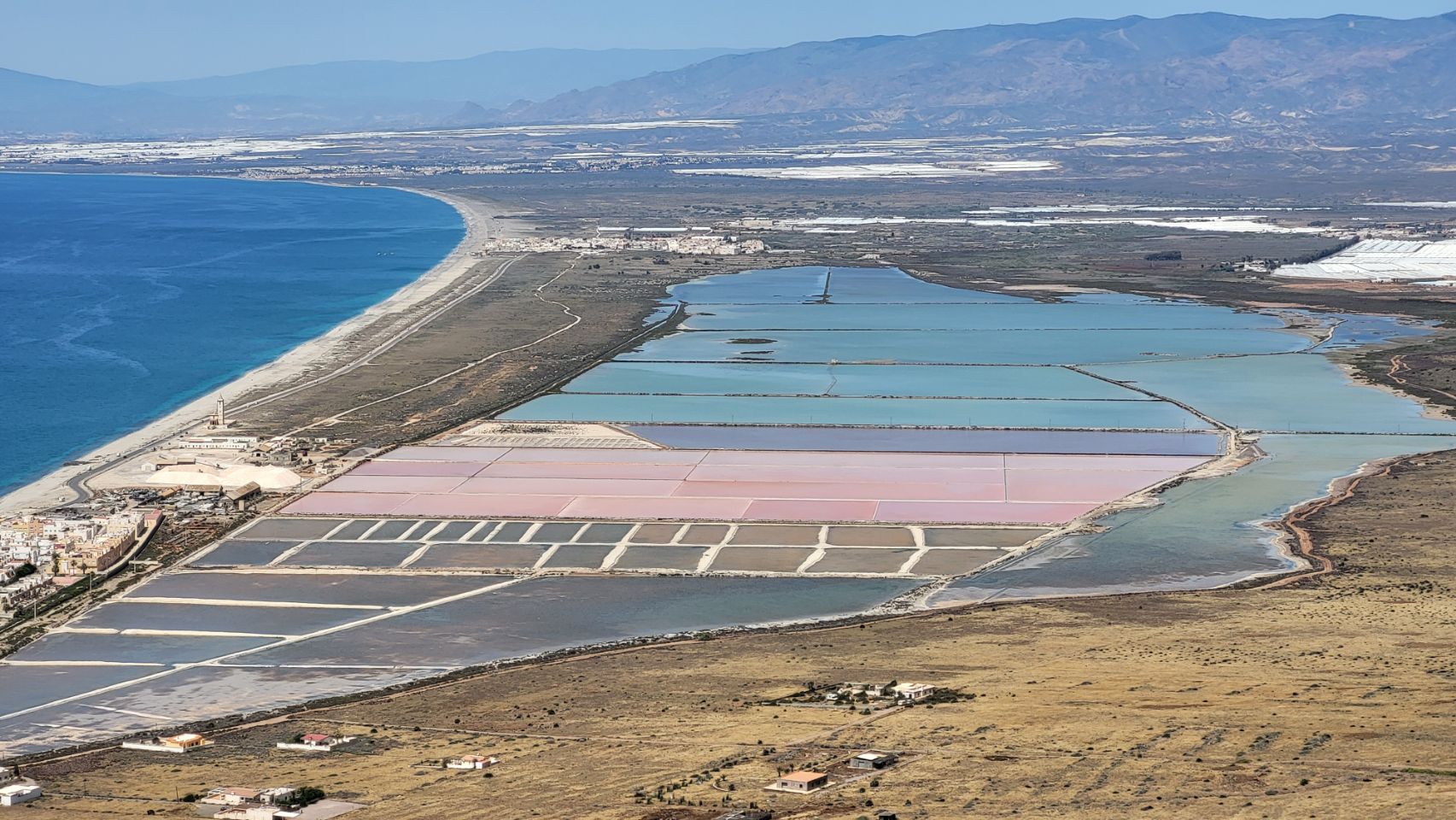 Het water is overigens lekker om te zwemmen, maar voor snorkelen toch wel koud. We drinken een koffie en gaan terug via een pad door de vulkaanbergen. Dat blijkt nog een behoorlijke uitdaging. Het pad is steil en vol losse stenen. Moeilijk te zien ook, maar de navigatie houdt ons op de juiste route. Eenmaal boven hebben we een fantastisch uitzicht op de de zoutpannen. We hebben flink wat hoogtemeters gemaakt en die moeten dus ook weer naar beneden. Op de fiets altijd fijn, lopend een stuk minder. Maar wij houden wel van een beetje klauteren en stappen zo veel mogelijk via de ruwe grotere lavakeien naar beneden. Het is behoorlijk warm geworden en beneden duiken we weer in zee voordat we terug fietsen naar ons dorp. ’s Avonds gaan we wat hotels en treinen boeken op het traject dat we gisteren hebben bepaald. Maar de trein vanuit Almerîa een stuk noordwaarts tot in de bergen is niet te boeken, vol. Daarna kan ook niet omdat er vanwege werkzaamheden bussen worden ingezet. Geen kans dus op vervoer met de fiets, we moeten ons hele plan omgooien en gaan verder via de kust. We gaan daardoor wel een mooie route door de bergen missen helaas.