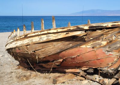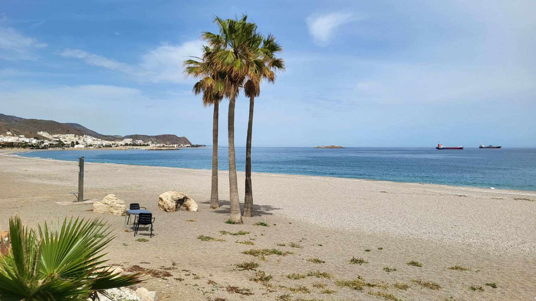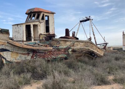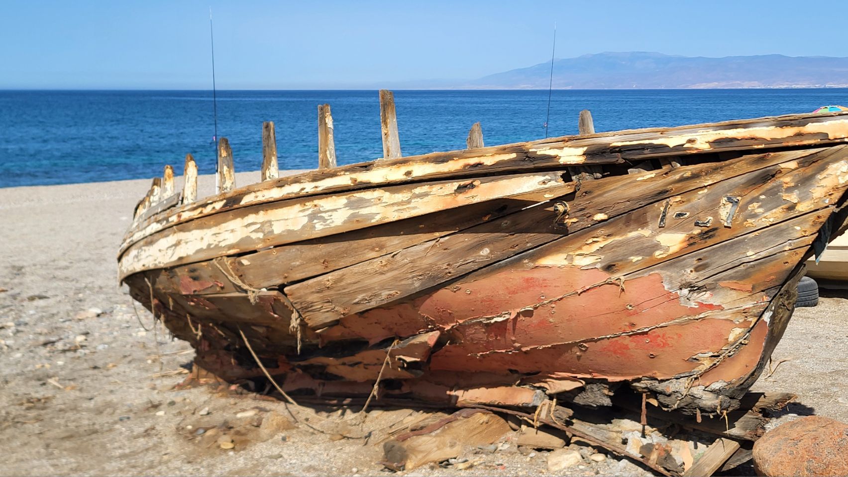 Onze route van 87 km gaat naar Garroucha dat aan de andere kant van het natuurgebied ligt, ook aan de kust. Een mooie vervallen oude boot is geëxposeerd op het land. Meteen daarna rijden we midden tussen de foliekassen. Er staan vooral tomaten in, maar ook andere kasgroentes. Rond de kassen is het een bende van afval waaronder veel lappen plastic.