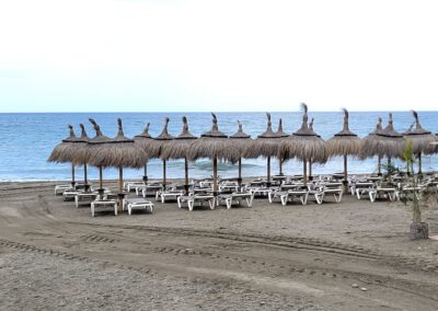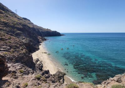 Na de kassen volgt leeg bergachtig land en dan zijn we weer bij de kust. We passeren mooie witte kustplaatsen met enorm brede stranden en mooie baaien. Ook hier bergen van vulkanische oorsprong met grillige vormen. Natuurlijk ga ik weer lekker zwemmen. Willem ging in het verleden altijd mee zwemmen maar nu nog maar zelden. Hij houdt niet meer van zout en zand. De bijna 500 hoogtemeters zitten in het eind van onze dag. We klimmen via haarspeldbochten hoger en hoger, op de top beloond met een prachtig uitzicht. Daarna weer dalen tot aan zee en dan blijft de weg de kustlijn volgen tot we bij ons hotel zijn. Weer een late aankomst, 19:30 uur. Snel douchen en dan eten, het wordt een pizza.