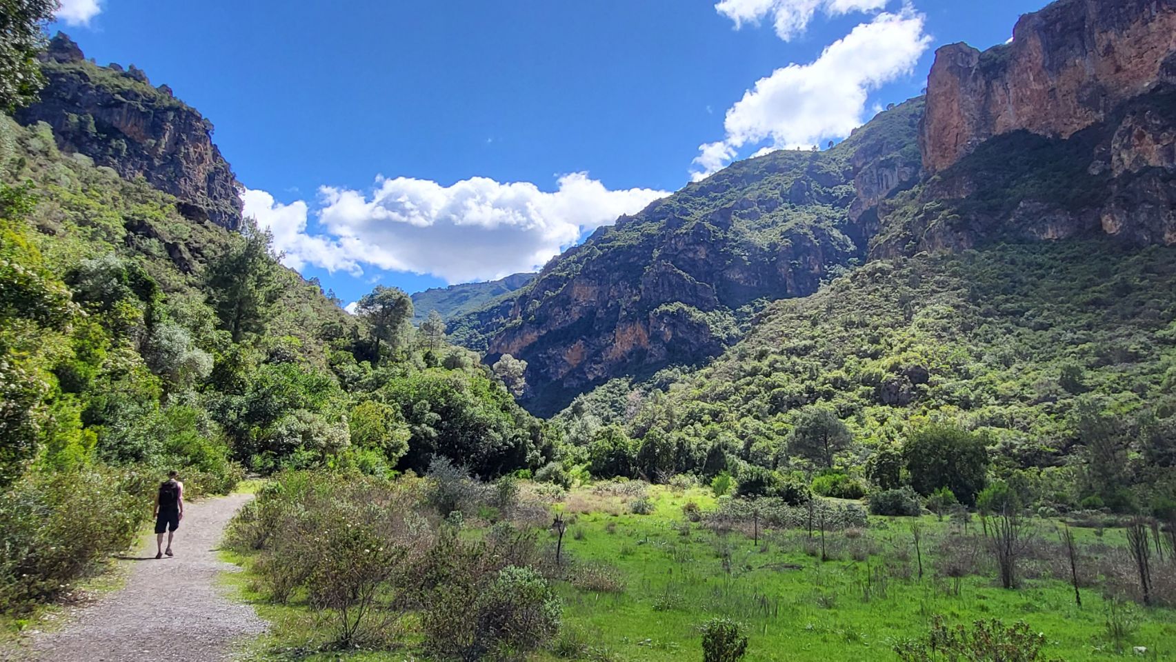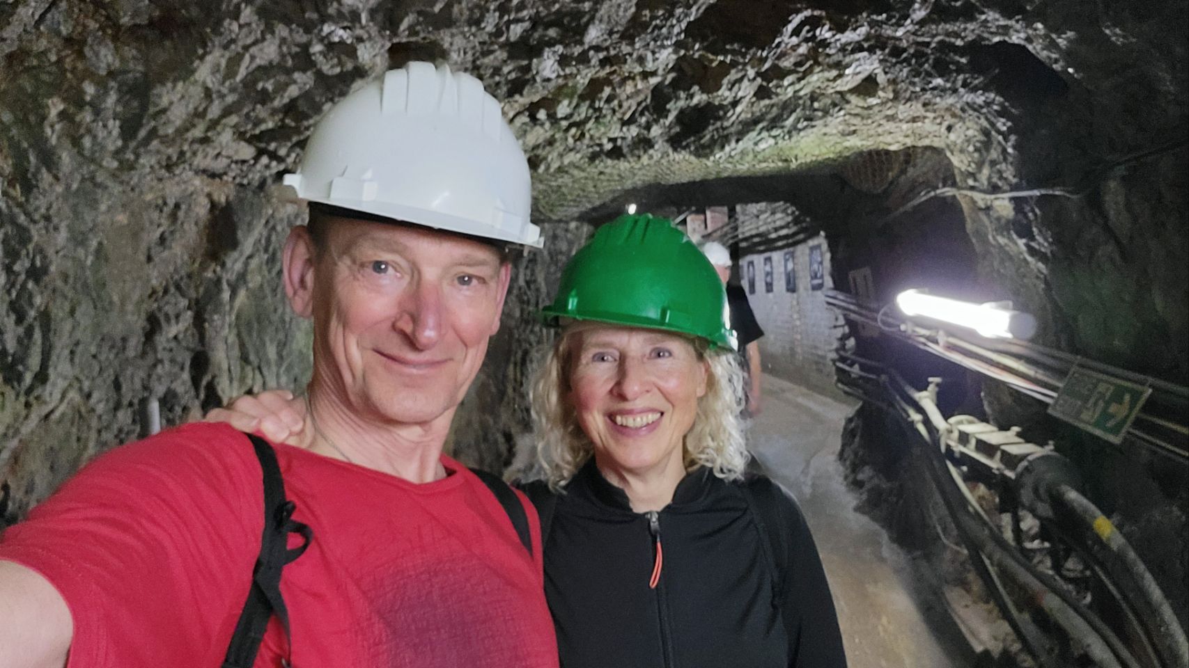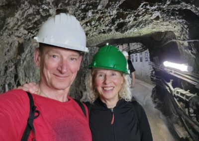Overigens zijn er weinig gasten en lijken enkele mensen te wonen in het hotel. We wandelen de 3 kilometer naar de auto en rijden er vervolgens 5 kilometer mee omhoog naar de start van een wandelroute in de bergen. Het zou een zonnige dag worden bij 15 graden. Lekker wandelweer dus, al zijn er toch verdacht veel wolken. De route begint nogal saai maar wordt wel steeds mooier. Helaas krijgen we weinig uitzichten over de bergen, daarvoor hadden we toch een uitdagender traject moeten kiezen met meer hoogtemeters. Het wandelpad loopt door enkele tunneltjes. Deze zijn gemaakt voor het vervoer van het in deze omgeving gewonnen ijzererts in het verleden.