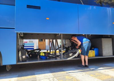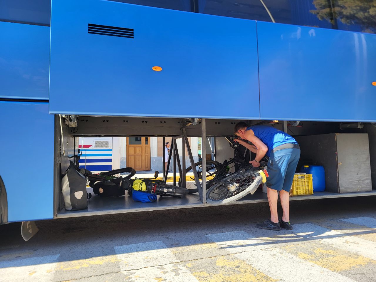 Om 9:00 uur gaat onze bus, dus we missen het ontbijt en maken daarom zelf maar een broodje op de kamer. Je kan hier meestal pas half 9 of 9:00 uur ontbijten. Ik heb de stangen van mijn fiets een beetje ingepakt met een opengeknipte plastic tas. Niet overbodig blijkt bij het inladen in het busruim. De fietsen moeten boven op elkaar liggen en de mannen die de bus inladen sjorren ze net zo lang heen en weer tot het past. Ik houd mijn hart vast over hoe ze er straks weer uit zullen komen. De busrit van drie uur blijkt toch wat langer want we doen er vijf uur over. Onderweg zien we twee keer een hotel, dus we hadden toch kunnen fietsen en overnachten. Maar ik ben verkouden en daardoor moe en vind het helemaal niet erg om dit bergachtige gebied lekker in de bus te overbruggen.