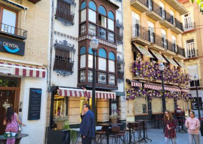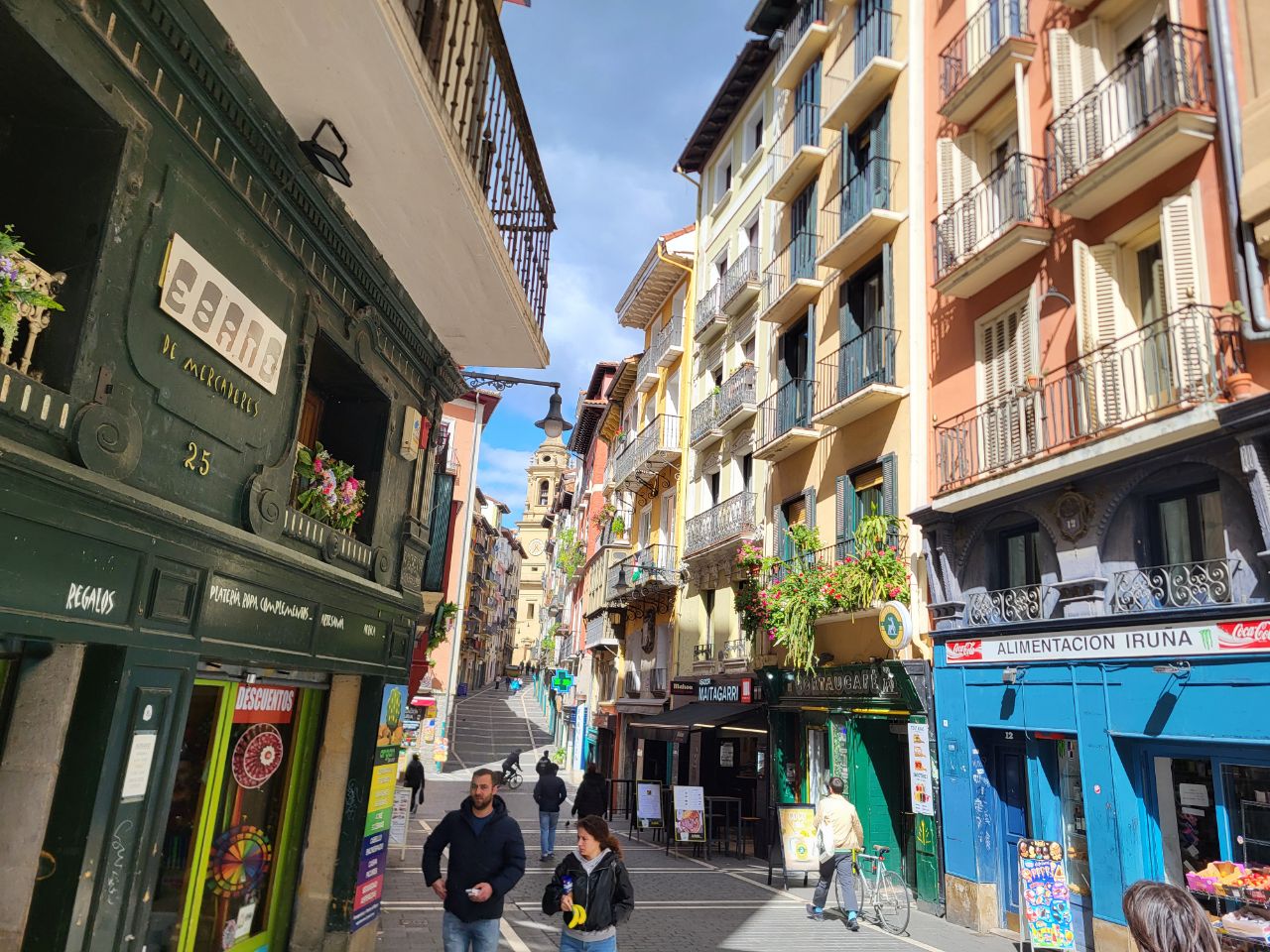 Het oude centrum van Pamplona is typisch Baskisch met vele cafeetjes met pintxos op de bar. Maar het is maandag en koud en het is dus een beetje een verlaten boel nu. We rijden door naar Irun. Hier blijven we drie nachten, onze geboekte trein naar Parijs gaat 8 mei, dus we moeten ons nog twee dagen vermaken.