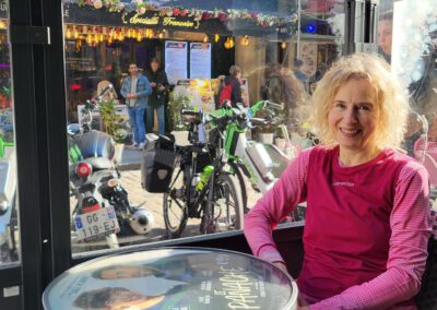 Op een terras eten we een heel goed drie-gangen menu voor 15 euro p.p. De prijzen midden in Parijs liggen inmiddels lager dan in Nederland! Parijs heeft tegenwoordig opvallend veel fietsers en fietspaden. Heel wat autobanen hebben een strook moeten inleveren dat nu een 2-richtingen fietspad is. We zitten nu in een snelle trein naar Hendaye aan de Spaanse grens waar we vannacht slapen.