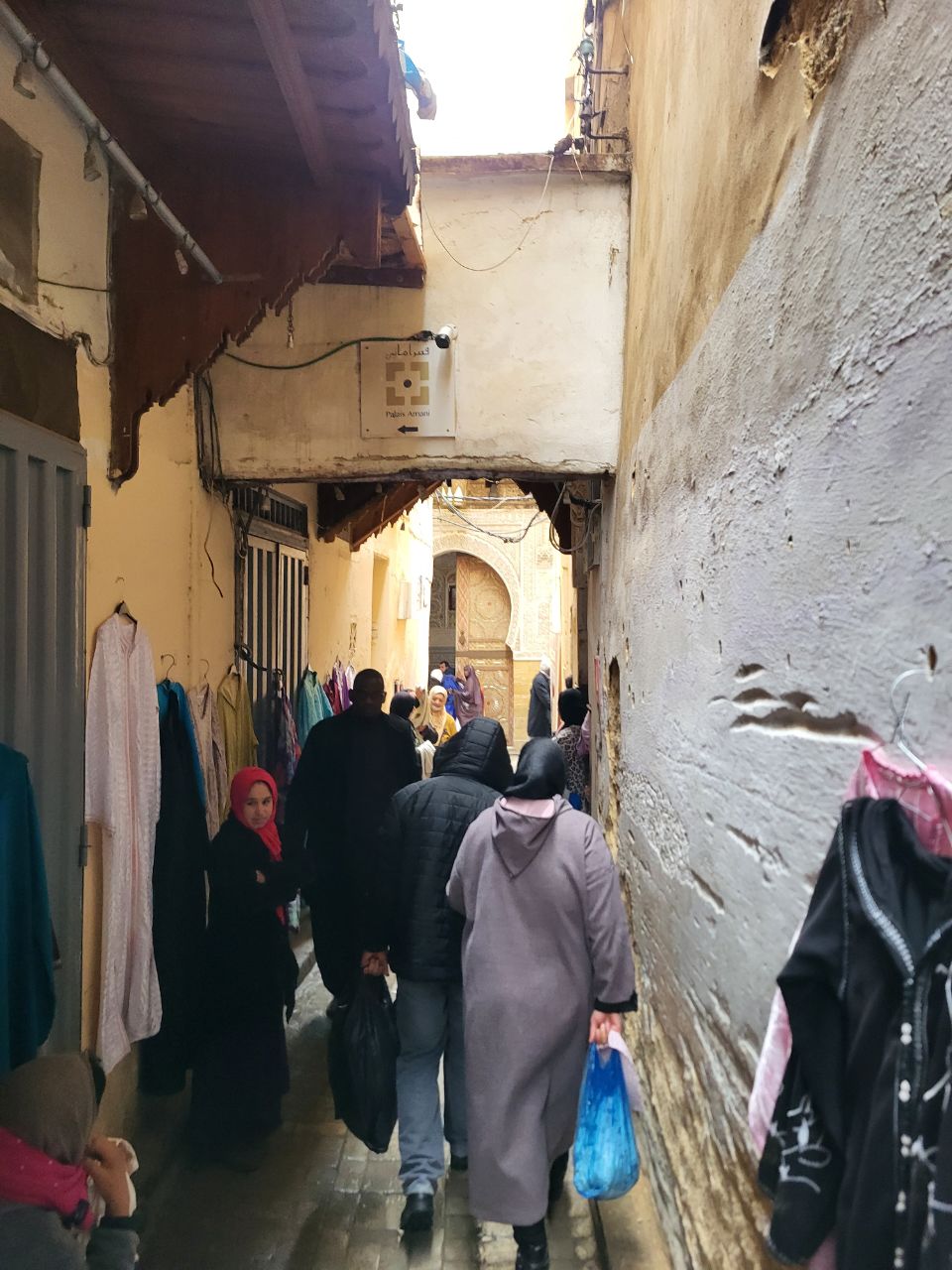 Om te kleuren worden ze ondergedompeld in grote stenen vaten met daarin natuurlijke kleurstoffen, zoals henna (rood), saffraan (geel), cederhout (bruin) en indigo (blauw). Daarna worden de huiden langs de muren van de looierij opgehangen om te drogen. Rond de looierij zitten veel winkeltjes waar mooie producten van het leer worden vervaardigd en verkocht. We bekijken ook nog een koranschool, uit de 12e eeuw, met veel houtbewerking dat goed geconserveerd is gebleven.. De dag begon zonnig maar al snel vielen de buien alweer. In de loop van de dag regent het onophoudelijk en is het ook koud. We gaan vroeg eten en duiken lekker vroeg ons bed in. Ook hier hebben we weer lekkage in de badkamer, nu vanuit het toilet. Als we doortrekken loopt een deel het riool in en een deel de badkamer. Het personeel zou het fixen vanmiddag, maar er is niets verbeterd.