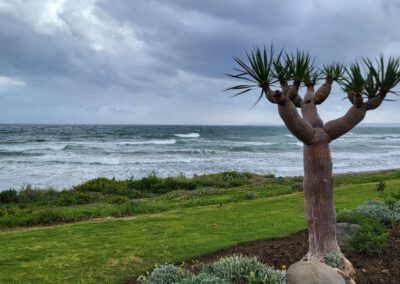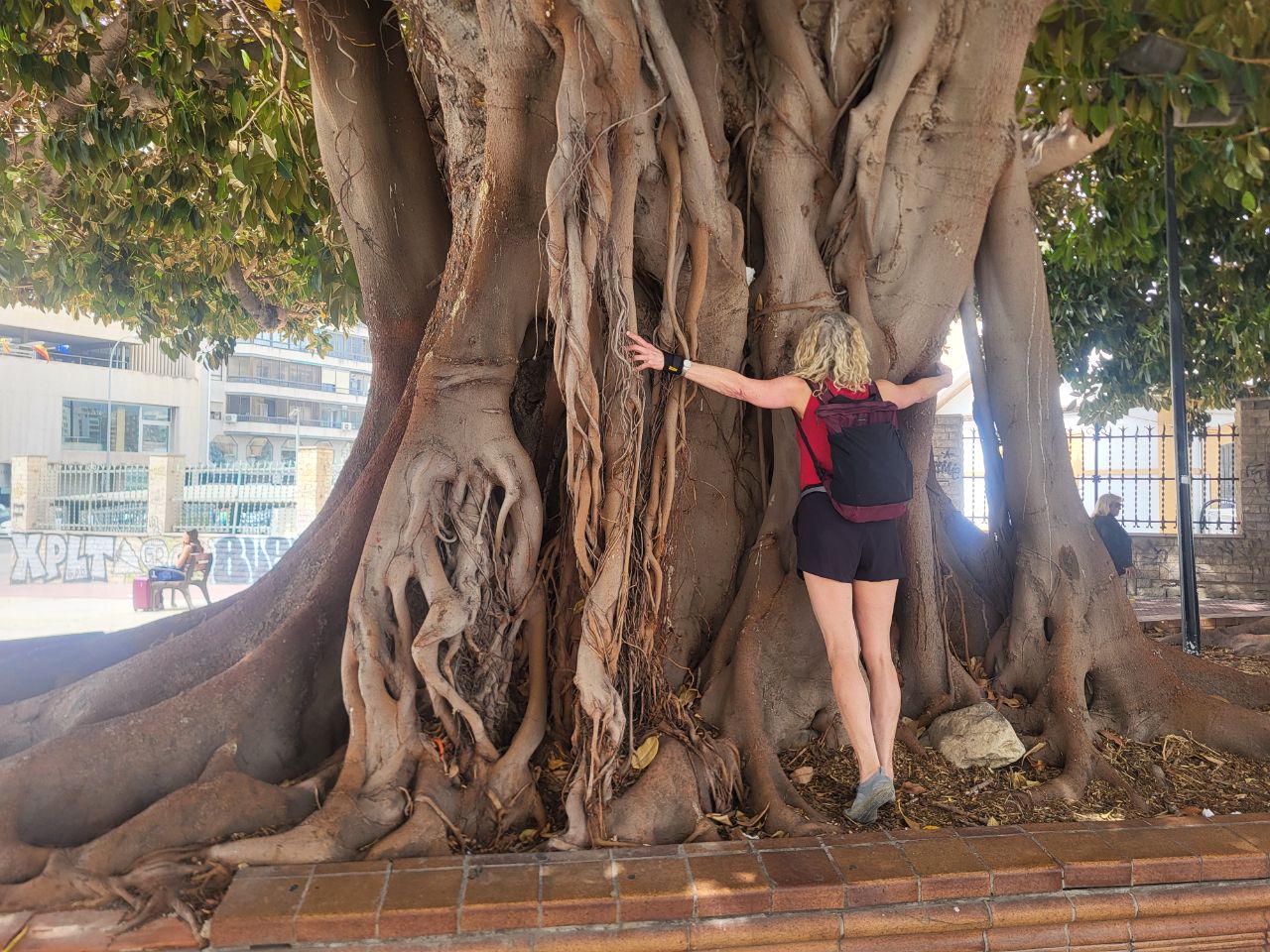 We lopen langs enkele enorm dikke bomen. Plantnet zegt dat het de Indische rubberboom is. Het is 21 graden maar er waait een fris windje. Op het strand is deze zowaar afwezig en is het heerlijk toeven. Het is weekend dus het strand ligt vol. Ik vind dat wel wat hebben, al dat bloot gezellig op een kluitje. Het is opvallend dat topless hier nog vrij gangbaar is, ook bij jongeren.