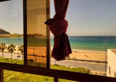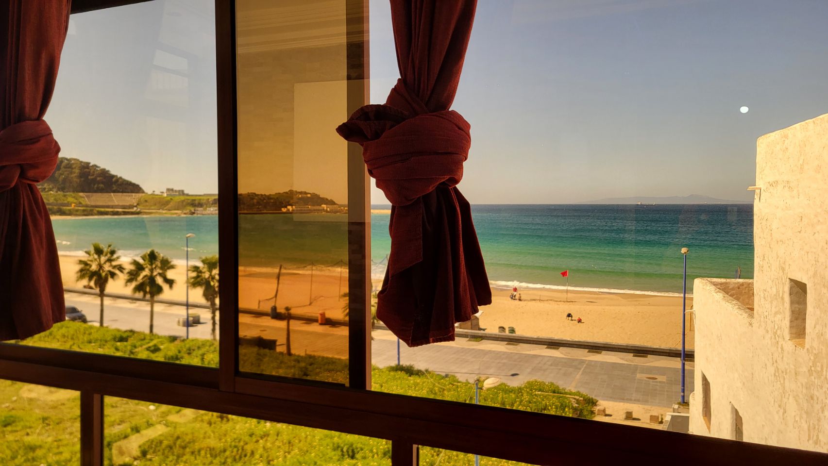 We nemen de boot van 13:00 uur zodat we in Tanger meteen kunnen inchecken in ons hotel. Maar dat uurtje varen neemt toch wat meer tijd in beslag met meerdere paspoortcontroles voor en na. We boarden samen met een Franse fietser en ze vertelt dat ze al vanaf december op de fiets onderweg is en nu eindelijk kan oversteken naar Marokko. Het was niet heel aangenaam om in de winter door Frankrijk en Spanje te fietsen en daardoor deed ze er zo lang over. En dan ook nog kamperen! Ze was eerder al naar Azië gefietst in acht maanden, wat dan weer snel is. De boot deint behoorlijk heen en weer en ik ga een tijdje buiten staan omdat ik er toch wel misselijk van word. Aan diverse gezichten te zien ben ik niet de enige.
