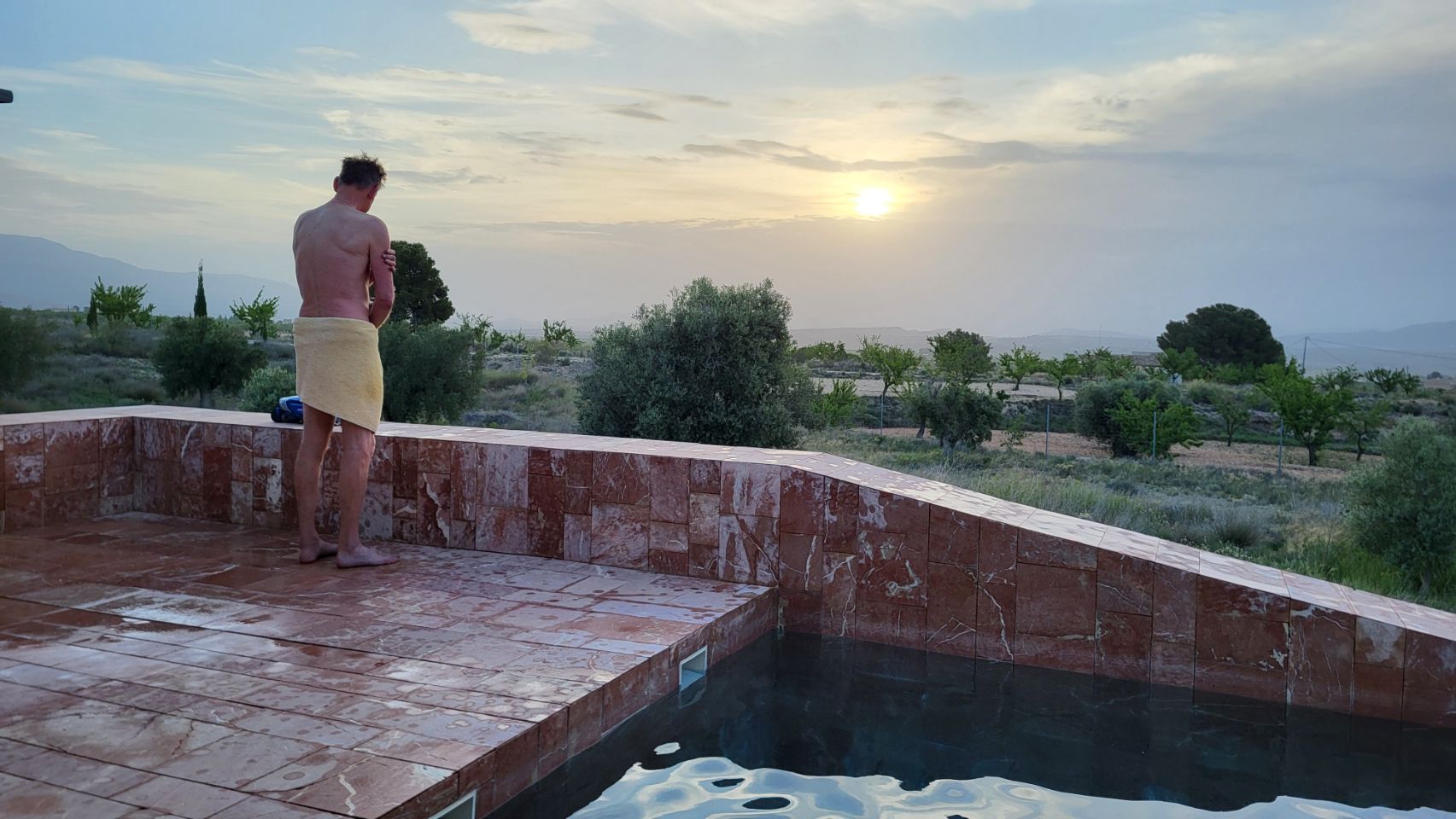Inmiddels is de tegenwind flink aangewakkerd. Dan kan je wel dalen, maar zonder stevig bijtrappen kom je er toch echt niet. Als we bij Almería komen wordt het landschap rommelig. Smerig ruikende industrie en veel tuinbouw in foliekassen. Rijk Zwaan zag hier ook kansen. En dan is daar eindelijk de zee en neem ik meteen even een heerlijke duik. We vervolgen de route over de boulevard tot deze eindigt en we dwars door groen en zand nog 14 km te gaan hebben. Niet zo’n goed idee, dus we zoeken de verharde weg weer op. Deze loopt door een enorm cactusveld waarvan een deel in bloei staat, de laatste levensfase van een cactus. In de bloei van je leven is voor een cactus geen goed nieuws. Volgens de borden fietsen we door een natuurgebied. Dat is ook de reden dat we voor deze locatie kozen. We zien dan wel veel cactussen, maar we zien ook heel veel foliekassen. Nog maar eens uitzoeken hoe dat hier zit met die natuur. Eindelijk komen we 19:00 uur aan in Gabo de Gata We verzamelen wat eten in twee minimarktjes zodat we straks ons hotelletje niet meer uit hoeven.