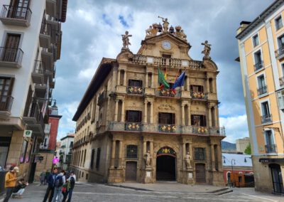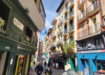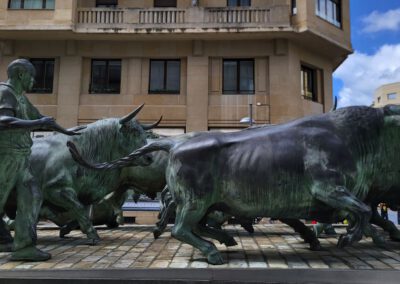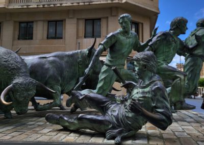 We rijden naar Irun, onze laatste bestemming. Onderweg paseren we Pamplona en we zijn wel benieuwd naar deze Baskische stad. De pelgrimsroute naar Santiago de Compostella loopt er dwars doorheen. De stad is vooral bekend om het jaarlijkse stierenrennen door de straten. Uiteindelijk worden de zwaar gestresste dieren de arena in gedreven om ’s avonds alsnog bij een stierengevecht te worden doodgemarteld. Gisteravond zagen we op TV in een kroeg een stierengevecht. Die matador stak steeds mis, zodat de stier met een hele rij dolken in zijn nek, bloedend en steeds verdwaasder, op zijn poten stond te wankelen. En het publiek bleef gewoon klappen. Er zijn steeds meer Spaanse plaatsen die er mee stoppen. Maar onder het mom van “cultureel erfgoed” worden er in vele plazas de torres nog steeds meer dan 6000 stieren jaarlijks gedood.