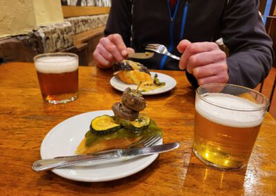 Daarna fietsen we verder door dit mooie landschap. Eindelijk komen we een koffietentje tegen. Het ruikt er muf en zurig en staat bomvol oude zooi, waardoor er nauwelijks nog iemand binnen kan zitten. Maar de koffie smaakt goed, al wordt ik wel een beetje onpasselijk van de zurige zweetlucht die de obese uitbater verspreidt. We lunchen in een ander café waar iedereen uit een menu van 12 euro kan kiezen. Drie gangen naar keuze, een drankje naar keuze en koffie inbegrepen! En alles is nog lekker ook!