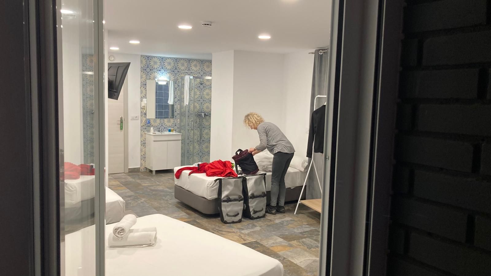 Onze kamer in het hotel blijkt een hele etage op de bovenste verdieping te zijn. Voor de prijs van een kamer krijgen we er een keuken en grote zitkamer bij. Helaas is het zondag en geen winkel is hier nu open om zelf iets te kunnen koken. We hebben uitzicht op de mooie Moorse toren en het is er lekker warm is want we krijgen de verwarming niet uit. Voor de zoveelste keer eten we patatas bravas en een salade. Bijna overal de enige keuze als je geen lappen vlees of vis wilt.